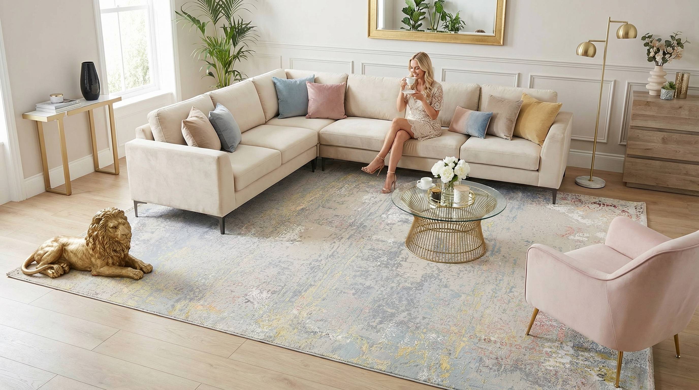 Dieser besonders helle und freundliche handgeknüpfte Designerteppich namens Eterno besticht durch seine harmonische Farbkomposition und sein einzigartiges Design. Die Hauptfarbe ist ein sanftes Beige, das dem Teppich eine warme und einladende Ausstrahlung verleiht. Perfekt für alle, die einen hellen Teppich suchen, denen Weiß aber zu langweilig ist. Ergänzt wird diese durch ein zartes Hellblau und subtile Akzente in Gelb, die dem Teppich eine frische und lebendige Note verleihen. Die ...mehr Beschreibung