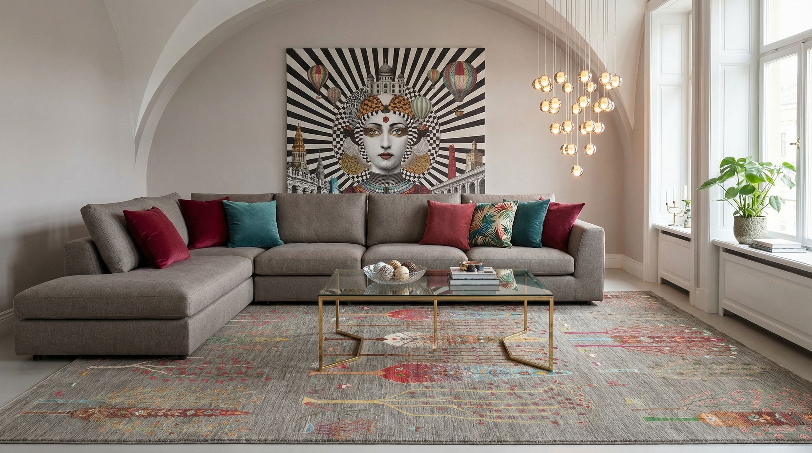 Als gekonnter Stilbruch eingesetzt, entfaltet dieser edle Teppich im Industrial-Style eine unglaubliche Wirkung, indem er einen warmen Kontrast zu kühlem Beton, Stahl und offenem Mauerwerk bildet. Die organischen Formen der Lebensbäume und die weiche Textur der Schafwolle nehmen dem rauen Fabrik-Chic die Härte und machen das Loft wohnlich und luxuriös. Die sichtbare Handwerkskunst und die Geschichte, die in jedem Knoten steckt, treten in einen spannenden Dialog mit der funktionalen Nüchternheit des Industriellen. So schaffen Sie mit diesem widerstandsfähigen Spitzenstück eine Insel der Geborgenheit und Kultur, die Ihren Wohnraum visuell aufwertet und ihm Charakter verleiht.