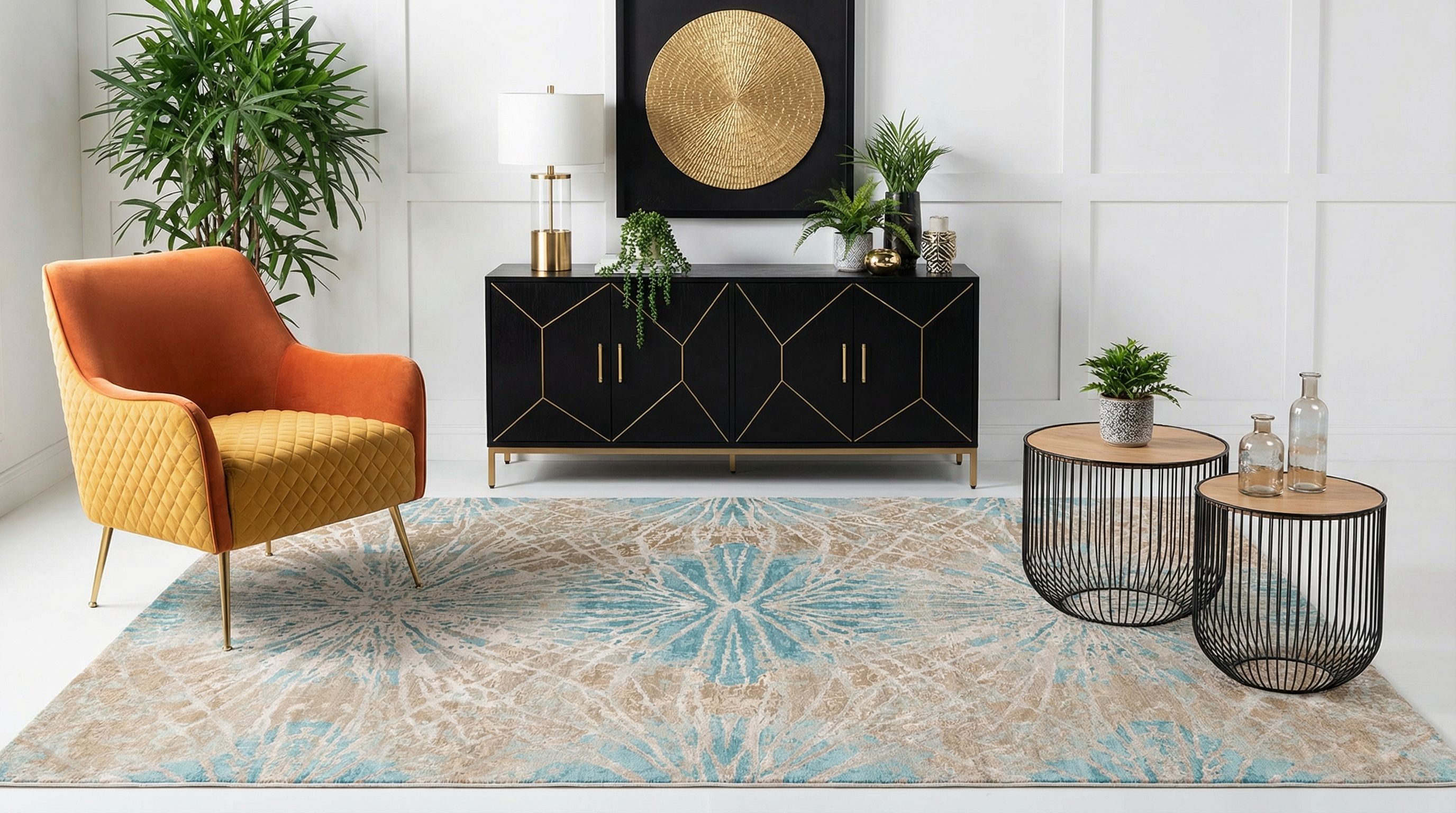 Hier präsentieren wir einen exquisiten handgeknüpften Designerteppich aus Indien, der durch seine moderne und zugleich elegante Erscheinung besticht. Die Hauptfarbe des Teppichs ist ein sanftes Beige, das eine warme und einladende Atmosphäre schafft. Dazu kontrastiert ein frisches Türkis, das lebendige Akzente setzt und dem Design eine dynamische Tiefe verleiht. Dezente Weißtöne ergänzen das Farbspiel und sorgen für harmonische Übergänge.Das Muster des Teppichs ist komplex und ...