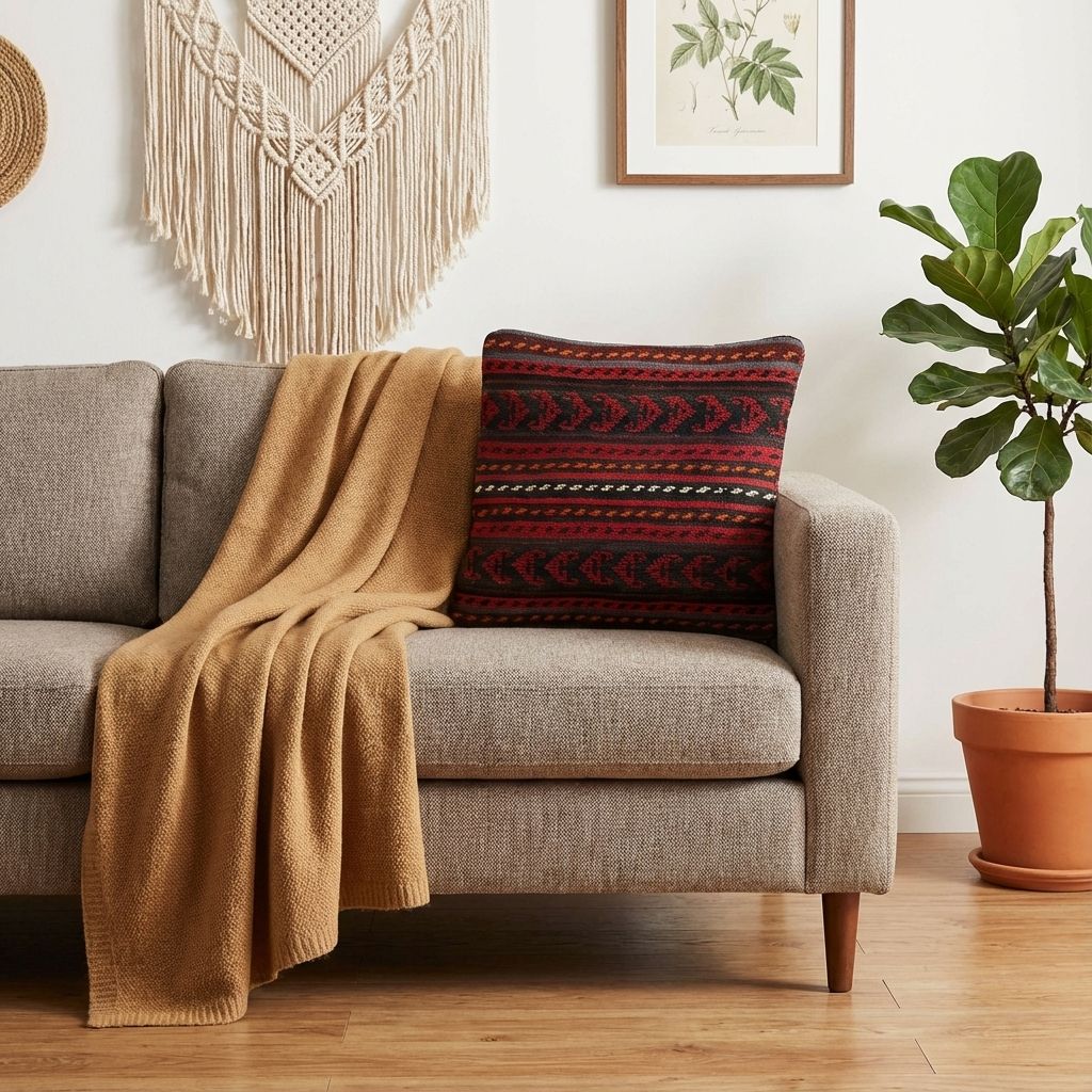 In einem reduzierten, modernen Ambiente fungiert dieses kunstvolle Kissen als raffinierter, wärmender Akzent, der die Brücke zwischen Tradition und Moderne schlägt. Das markante geometrische Rautenmuster wirkt zeitlos und bricht die Strenge minimalistischer Designermöbel gekonnt auf, ohne den klaren Look zu überladen. Die wundervoll warme Farbpalette verleiht kühlen, glatten Oberflächen sofort eine wohnliche Tiefe und eine hochwertige haptische Dimension. Es beweist eindrucksvoll, dass uralte Handwerkskunst perfekt in ein zeitgemäßes, designorientiertes Wohnambiente passt.