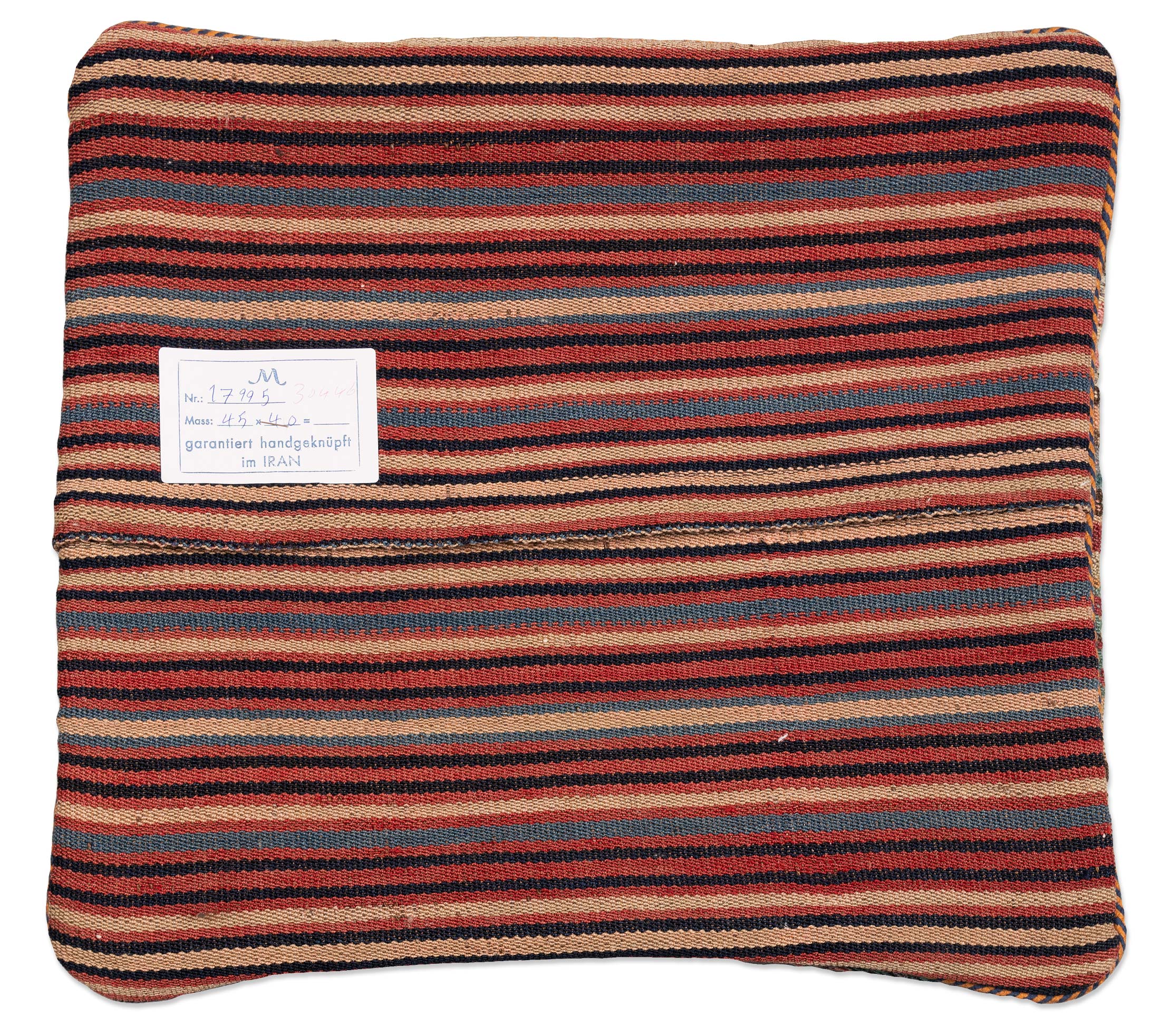 Hier präsentieren wir ein bezauberndes Schahsawan-Kelimkissen, das sowohl durch seine Farbvielfalt als auch durch seine kunstvolle Verarbeitung besticht. Die Hauptfarbe dieses Zierkissens ist ein warmes Rostrot, das sich harmonisch mit weiteren erdigen Tönen kombiniert. Ein lebendiges Türkis und ein sanftes Beige setzen lebendige Akzente, während ein tiefes Braun die Komposition abrundet. Die Musterung zeichnet sich durch abwechslungsreiche geometrische Streifen aus, die dem Kissen einen ...mehr Beschreibung