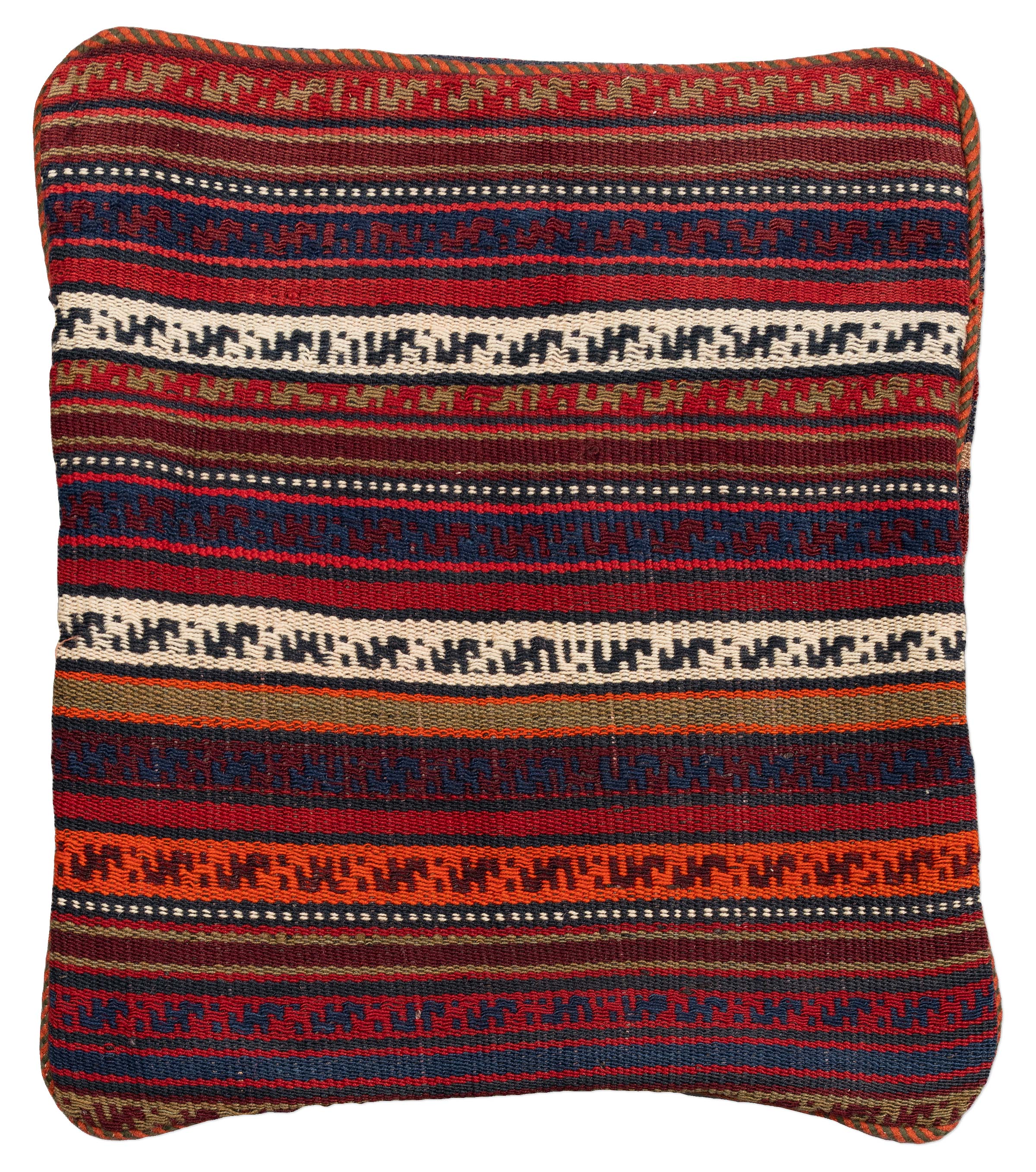 Hier präsentieren wir ein einzigartiges Schahsawan-Zierkissen aus Persien, das durch seine lebendige Farbpalette und traditionelle Muster besticht. Die Hauptfarbe dieses handgewebten Djidjim-Kissens ist ein intensives Rot, das durch die kunstvolle Kombination weiterer Farben wie Dunkelblau, Cremeweiß und einem warmen Orange ergänzt wird. Das Design zeigt klassische geometrische Muster, die in harmonischen Streifen angeordnet sind und dem Kissen eine dynamische und dennoch ausgewogene Ästhetik verleihen.