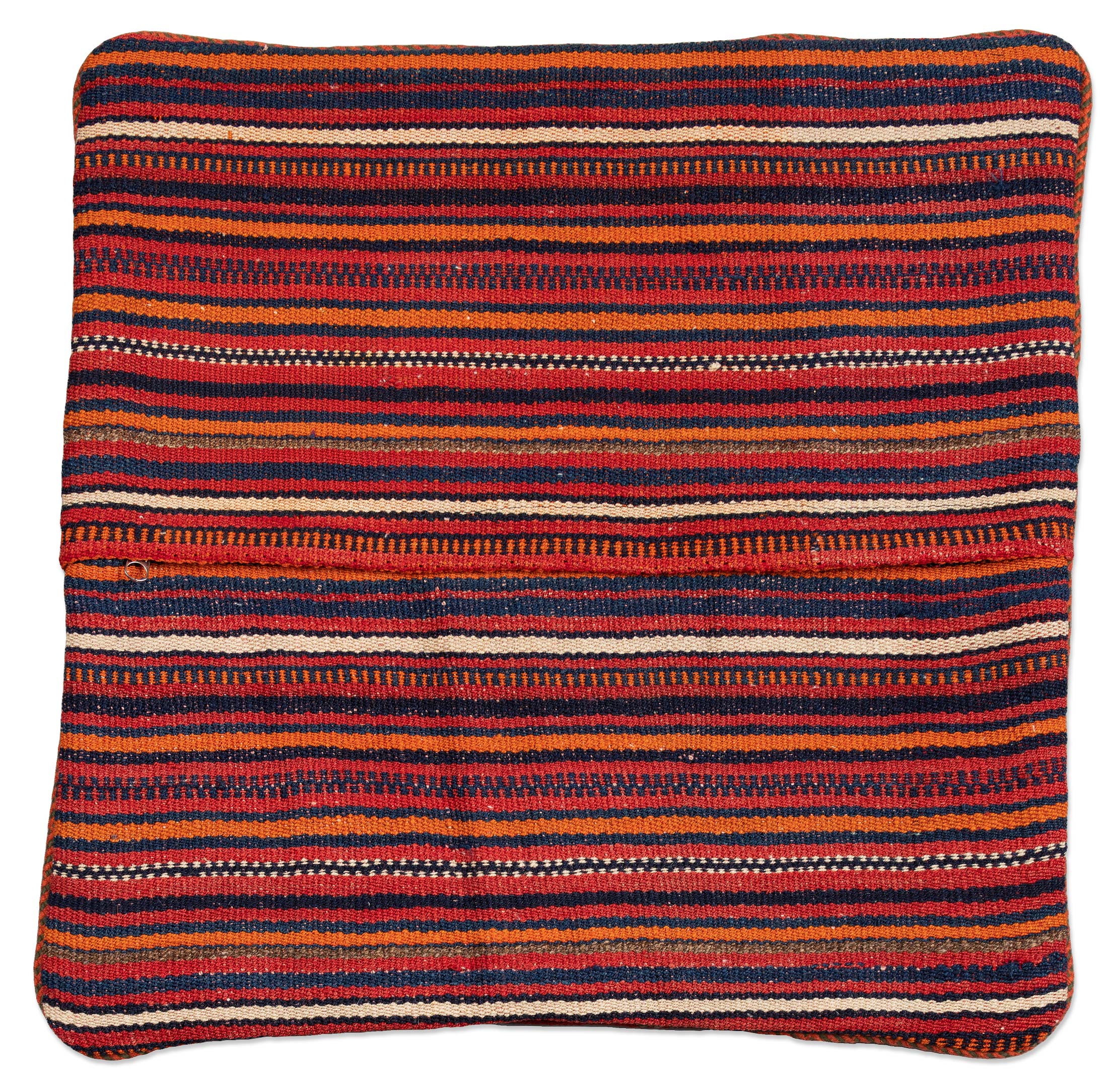 Hier präsentieren wir ein einzigartiges Schahsawan-Kelimkissen aus Persien, das durch seine faszinierende Farbkomposition und kunstvolle Handwerkskunst besticht. Die Hauptfarbe ist ein kräftiges Rot, begleitet von warmen Orangetönen und tiefem Braun, die dem Kissen eine lebendige und zugleich elegante Ausstrahlung verleihen. Dezente Akzente in Beige und Blaugrün setzen besondere Highlights und unterstreichen das kunstvoll gewebte Muster. Die wellenartigen Linienmuster, die sich über die gesamte Fläche erstrecken, verleihen dem Design eine dynamische Note, die an die fließende Bewegung von Wasser erinnert.