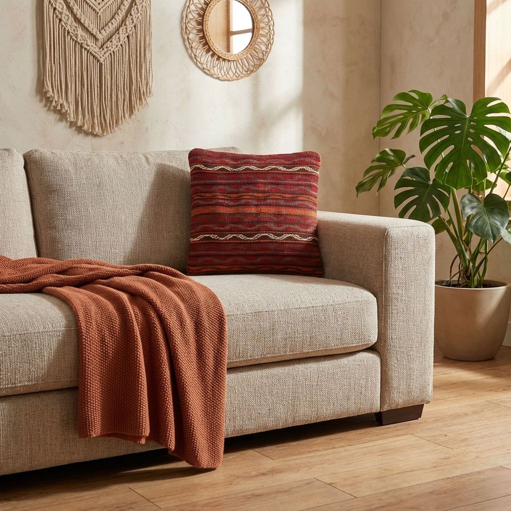In einem reduzierten, modernen Ambiente fungiert dieses kunstvolle Kissen als raffinierter, wärmender Akzent, der die Brücke zwischen Tradition und Moderne schlägt. Das markante geometrische Rautenmuster wirkt zeitlos und bricht die Strenge minimalistischer Designermöbel gekonnt auf, ohne den klaren Look zu überladen. Die wundervoll warme Farbpalette verleiht kühlen, glatten Oberflächen sofort eine wohnliche Tiefe und eine hochwertige haptische Dimension. Es beweist eindrucksvoll, dass uralte Handwerkskunst perfekt in ein zeitgemäßes, designorientiertes Wohnambiente passt.