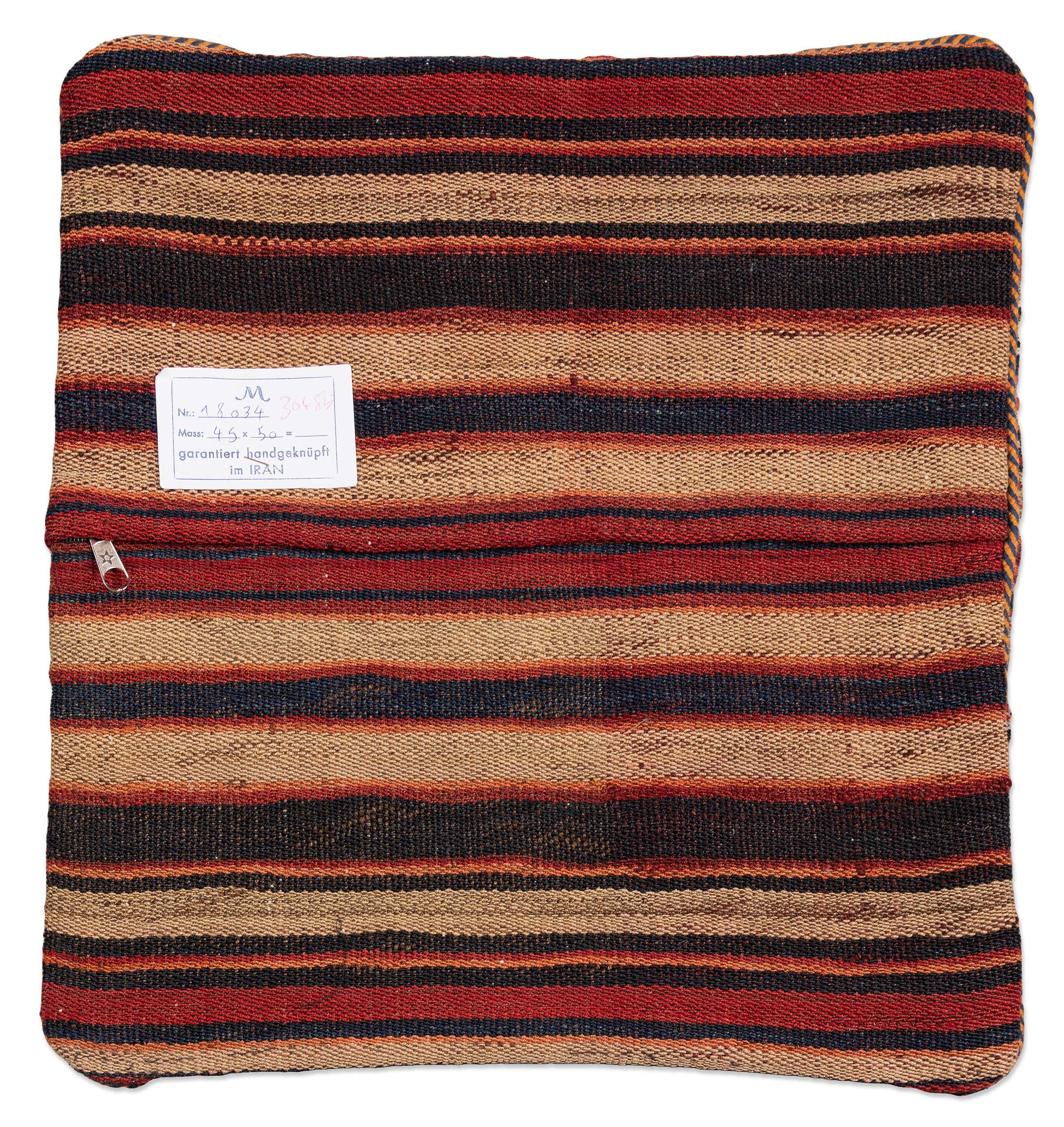 Das handgewebte Muster des Kissens ist geprägt von traditionellen geometrischen Streifen, die kunstvoll ineinanderfließen. Diese Musterung spiegelt die reiche Handwerkskunst der persischen Nomaden wider, die mit viel Liebe zum Detail gearbeitet wurde. Das Zierkissen wird inklusive einer passenden Kissenfüllung geliefert und ist auf der Rückseite ebenfalls aus echtem Kelim gefertigt. Ein praktischer Reißverschluss ermöglicht einfaches Beziehen.