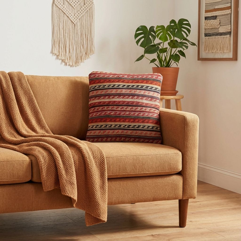 In einem reduzierten, modernen Ambiente fungiert dieses kunstvolle Kissen als raffinierter, wärmender Akzent, der die Brücke zwischen Tradition und Moderne schlägt. Das markante geometrische Rautenmuster wirkt zeitlos und bricht die Strenge minimalistischer Designermöbel gekonnt auf, ohne den klaren Look zu überladen. Die wundervoll warme Farbpalette verleiht kühlen, glatten Oberflächen sofort eine wohnliche Tiefe und eine hochwertige haptische Dimension. Es beweist eindrucksvoll, dass uralte Handwerkskunst perfekt in ein zeitgemäßes, designorientiertes Wohnambiente passt.