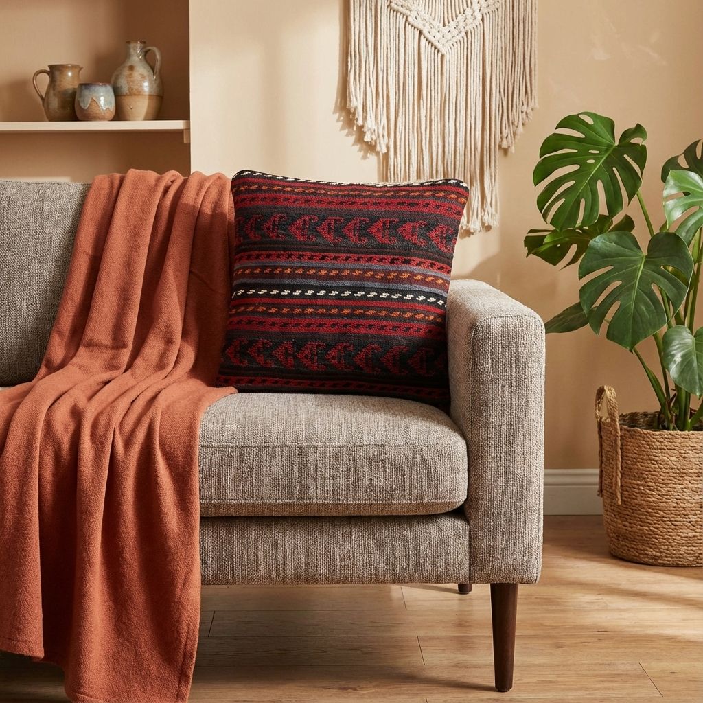 In einem reduzierten, modernen Ambiente fungiert dieses kunstvolle Kissen als raffinierter, wärmender Akzent, der die Brücke zwischen Tradition und Moderne schlägt. Das markante geometrische Rautenmuster wirkt zeitlos und bricht die Strenge minimalistischer Designermöbel gekonnt auf, ohne den klaren Look zu überladen. Die wundervoll warme Farbpalette verleiht kühlen, glatten Oberflächen sofort eine wohnliche Tiefe und eine hochwertige haptische Dimension. Es beweist eindrucksvoll, dass uralte Handwerkskunst perfekt in ein zeitgemäßes, designorientiertes Wohnambiente passt.