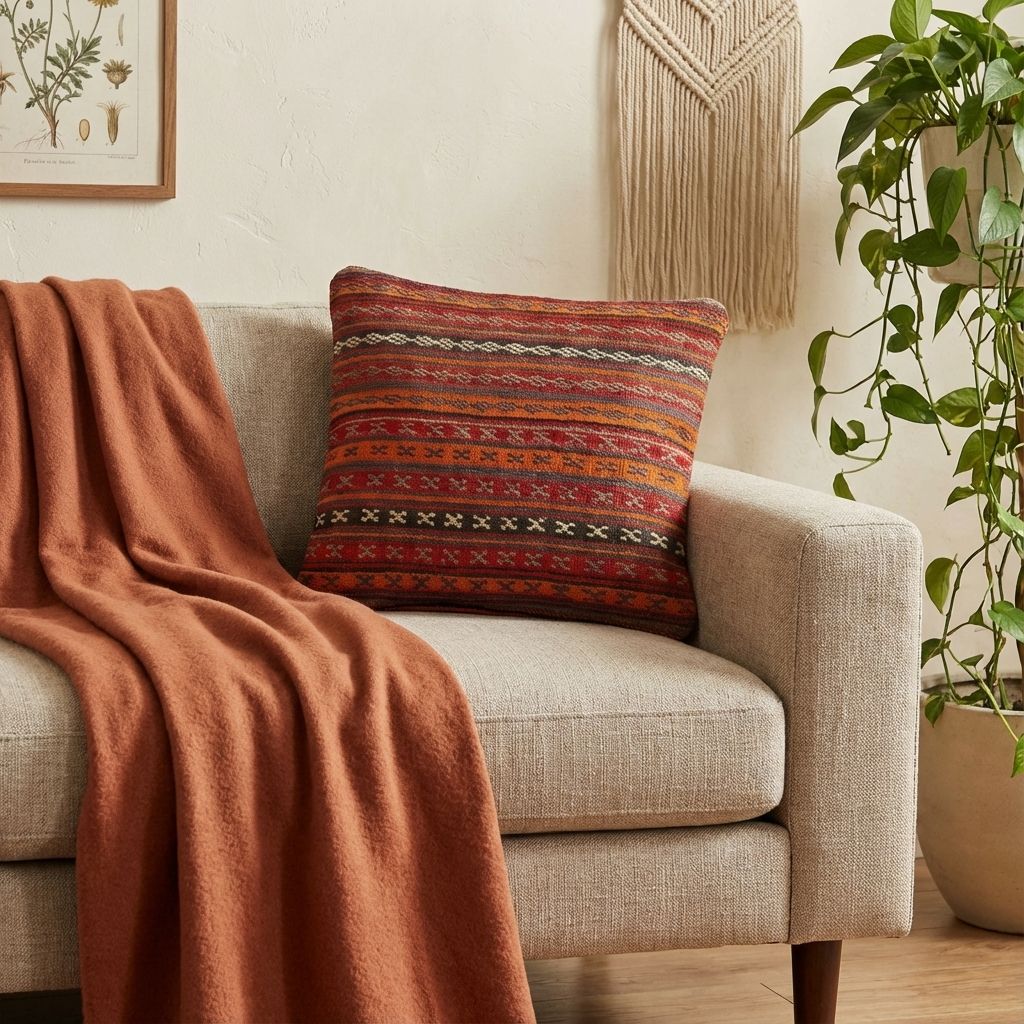 In einem reduzierten, modernen Ambiente fungiert dieses kunstvolle Kissen als raffinierter, wärmender Akzent, der die Brücke zwischen Tradition und Moderne schlägt. Das markante geometrische Rautenmuster wirkt zeitlos und bricht die Strenge minimalistischer Designermöbel gekonnt auf, ohne den klaren Look zu überladen. Die wundervoll warme Farbpalette verleiht kühlen, glatten Oberflächen sofort eine wohnliche Tiefe und eine hochwertige haptische Dimension. Es beweist eindrucksvoll, dass uralte Handwerkskunst perfekt in ein zeitgemäßes, designorientiertes Wohnambiente passt.