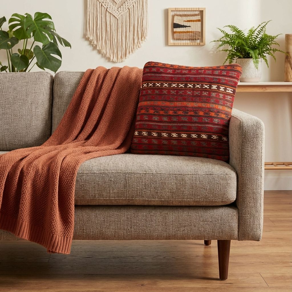 In einem reduzierten, modernen Ambiente fungiert dieses kunstvolle Kissen als raffinierter, wärmender Akzent, der die Brücke zwischen Tradition und Moderne schlägt. Das markante geometrische Rautenmuster wirkt zeitlos und bricht die Strenge minimalistischer Designermöbel gekonnt auf, ohne den klaren Look zu überladen. Die wundervoll warme Farbpalette verleiht kühlen, glatten Oberflächen sofort eine wohnliche Tiefe und eine hochwertige haptische Dimension. Es beweist eindrucksvoll, dass uralte Handwerkskunst perfekt in ein zeitgemäßes, designorientiertes Wohnambiente passt.