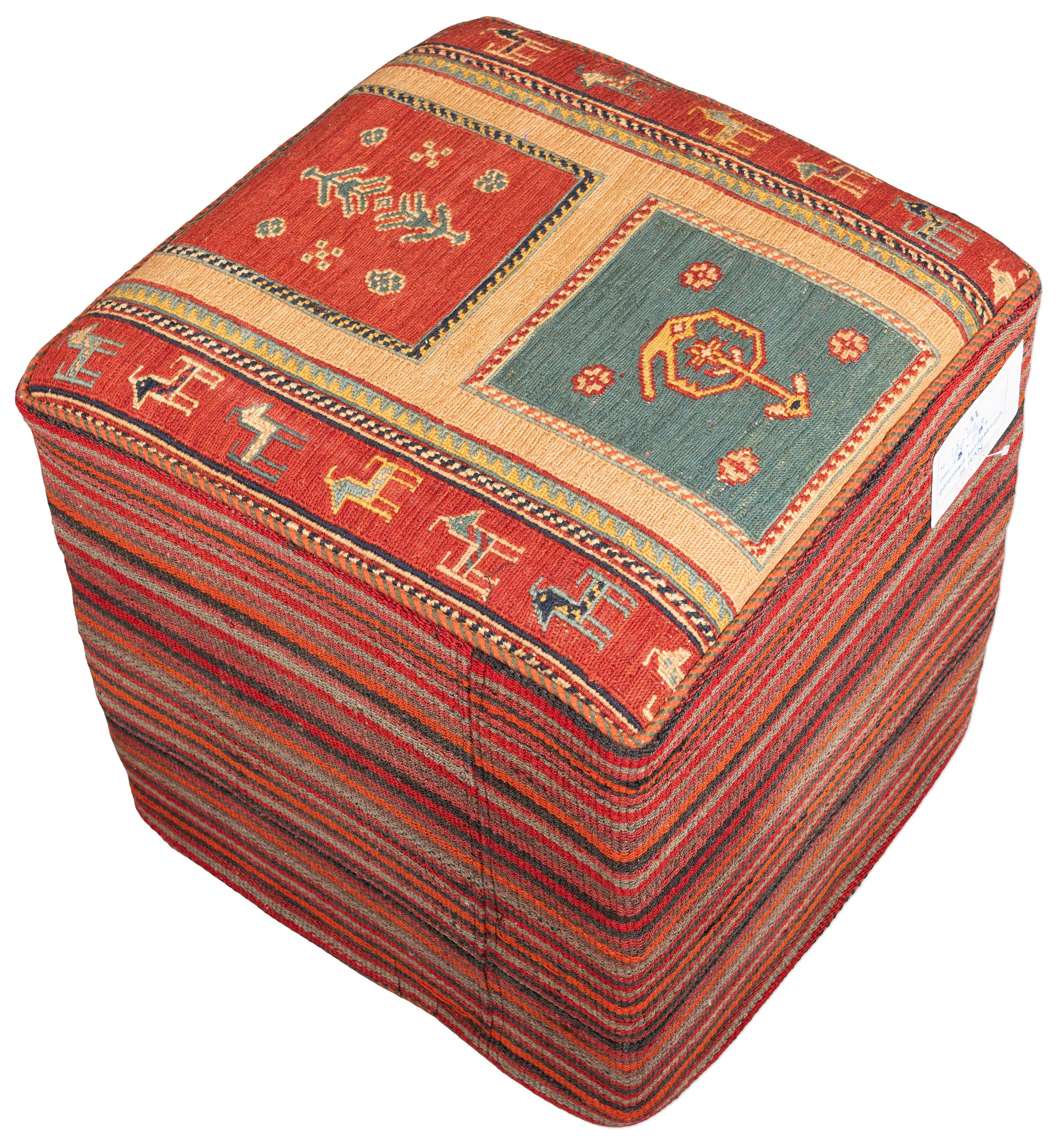 Afschar-Tabii-Sitzwürfel: Entdecken Sie unseren äußerst hochwertigen, vollständig handgemachten und langlebigen Sitzwürfel, der aus echten süd- und nordpersischen Webkelims gefertigt ist. Die Naturfarben und die handversponnene Schafwolle verleihen diesem vielseitig verwendbaren Hocker eine authentische und zeitlose Ausstrahlung. Die Oberseite besteht aus einem faszinierenden Afschar-Tabii-Sumack-Kelim, während alle fünf Seitenteile aus handgemachten alten und antiken Dscha-Dschim-Kelims bestehen (kein ...mehr Infos zur Herkunft