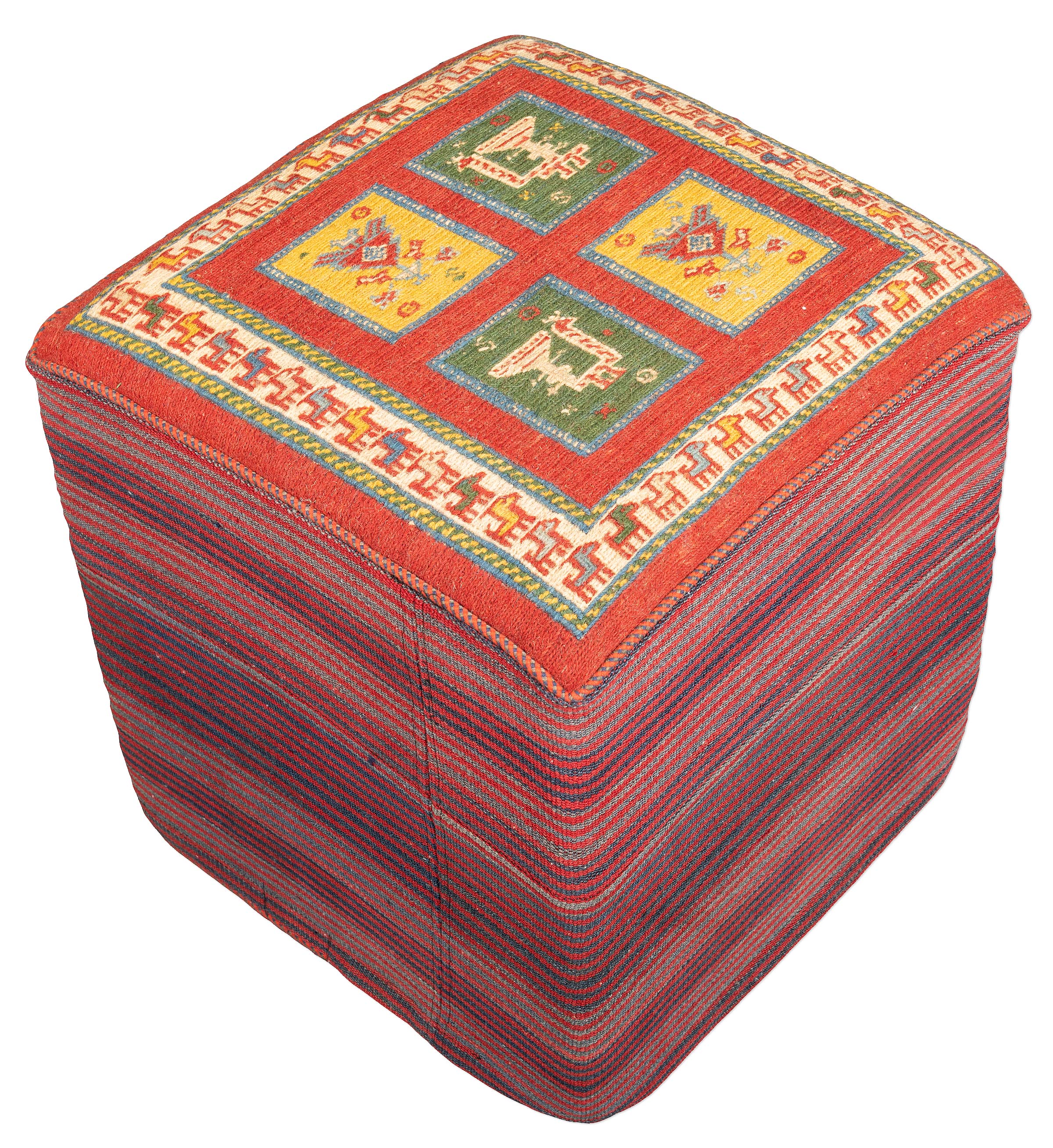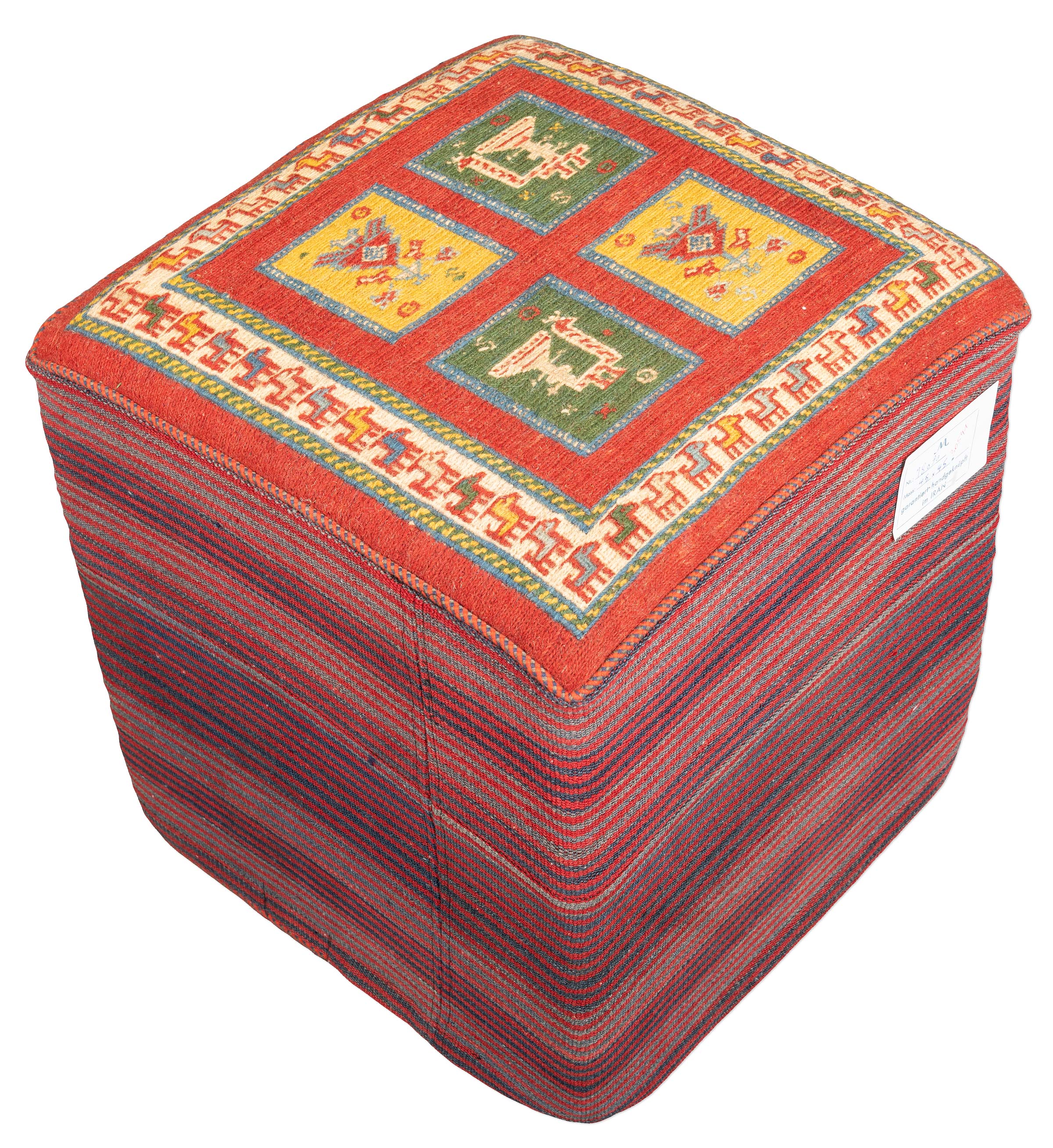 Afschar-Tabii-Sitzwürfel: Entdecken Sie unseren äußerst hochwertigen, vollständig handgemachten und langlebigen Sitzwürfel, der aus echten süd- und nordpersischen Webkelims gefertigt ist. Die Naturfarben und die handversponnene Schafwolle verleihen diesem vielseitig verwendbaren Hocker eine authentische und zeitlose Ausstrahlung. Die Oberseite besteht aus einem faszinierenden Afschar-Tabii-Sumack-Kelim, während alle fünf Seitenteile aus handgemachten alten und antiken Dscha-Dschim-Kelims bestehen (kein ...mehr Infos zur Herkunft