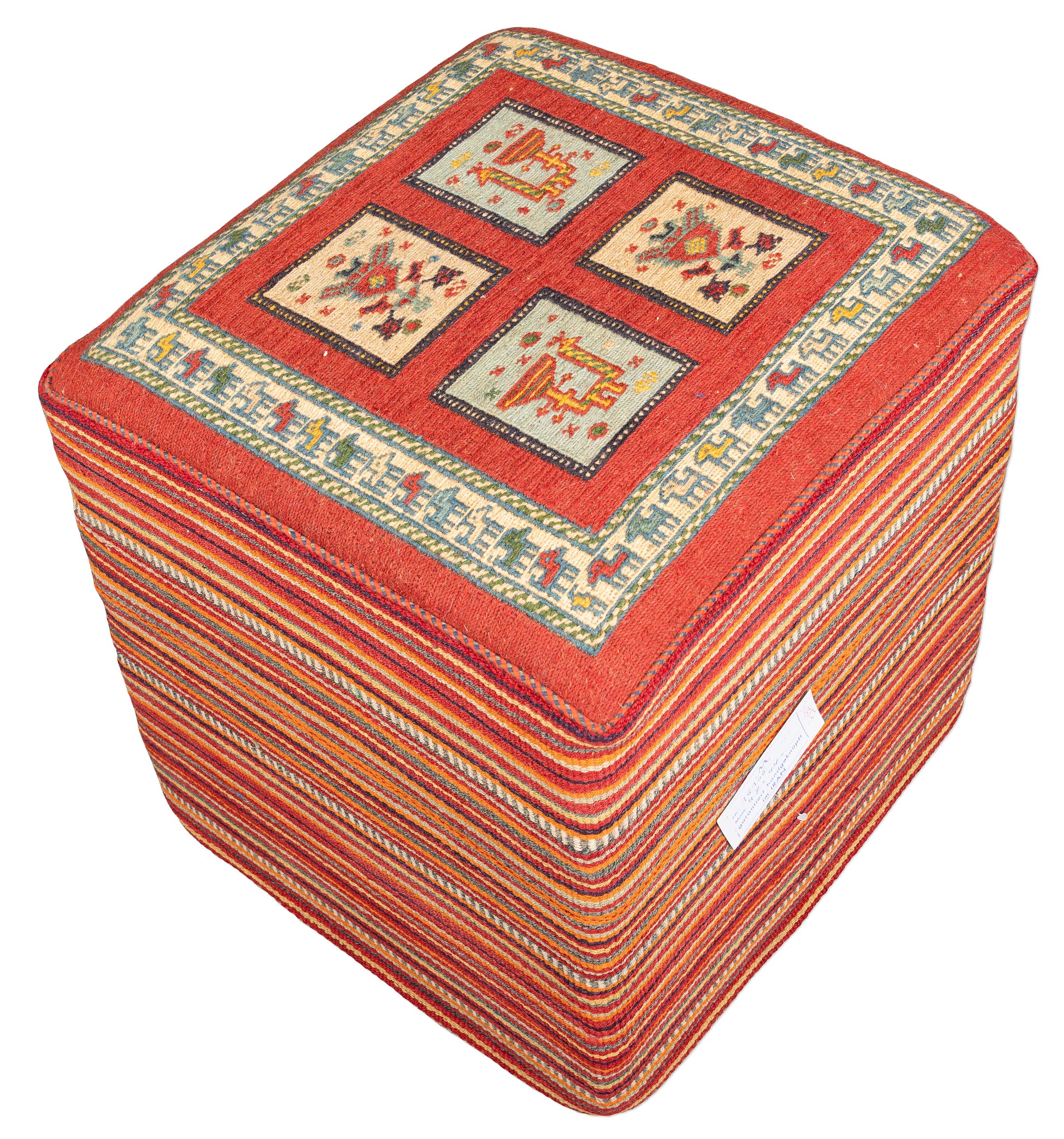 Afschar-Tabii-Sitzwürfel: Entdecken Sie unseren äußerst hochwertigen, vollständig handgemachten und langlebigen Sitzwürfel, der aus echten süd- und nordpersischen Webkelims gefertigt ist. Die Naturfarben und die handversponnene Schafwolle verleihen diesem vielseitig verwendbaren Hocker eine authentische und zeitlose Ausstrahlung. Die Oberseite besteht aus einem faszinierenden Afschar-Tabii-Sumack-Kelim, während alle fünf Seitenteile aus handgemachten alten und antiken Dscha-Dschim-Kelims bestehen (kein ...mehr Infos zur Herkunft