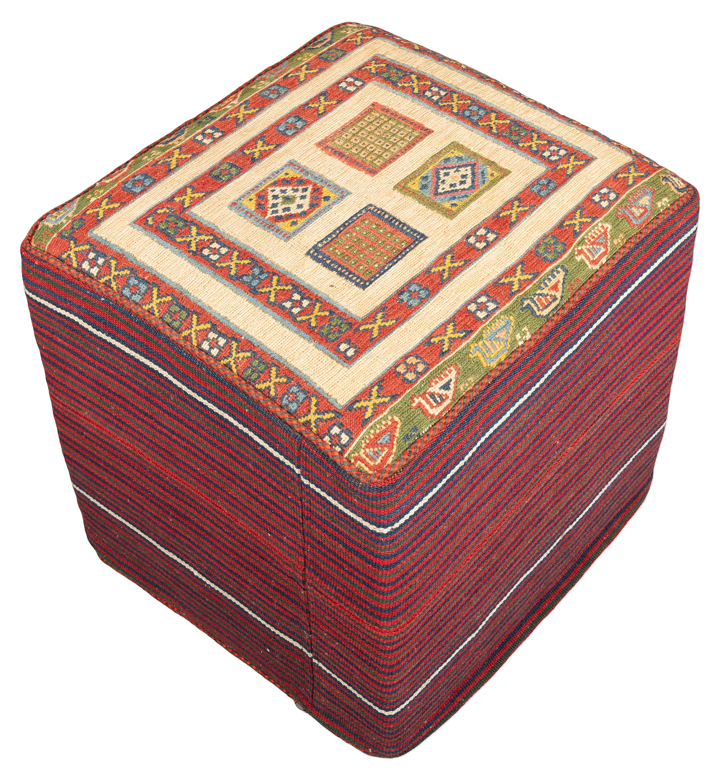 Hier präsentieren wir Ihnen einen exquisiten Sitzwürfel, der aus hochwertigen, handgefertigten Kelims besteht. Die Hauptfarbe des Teppichs ist ein warmes Rot, das durch ein sanftes Beige ergänzt wird. Akzente in Olivgrün und Blau verleihen dem Design eine lebendige Vielfalt. Die Musterung zeichnet sich durch geometrische Formen und traditionelle Motive aus, die in einem harmonischen Zusammenspiel arrangiert sind.Dieser Sitzwürfel ist nicht nur ein ästhetisches Highlight, sondern auch ...