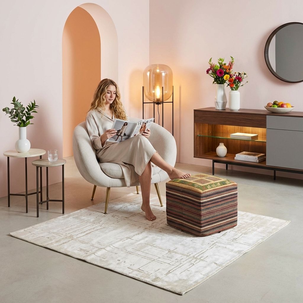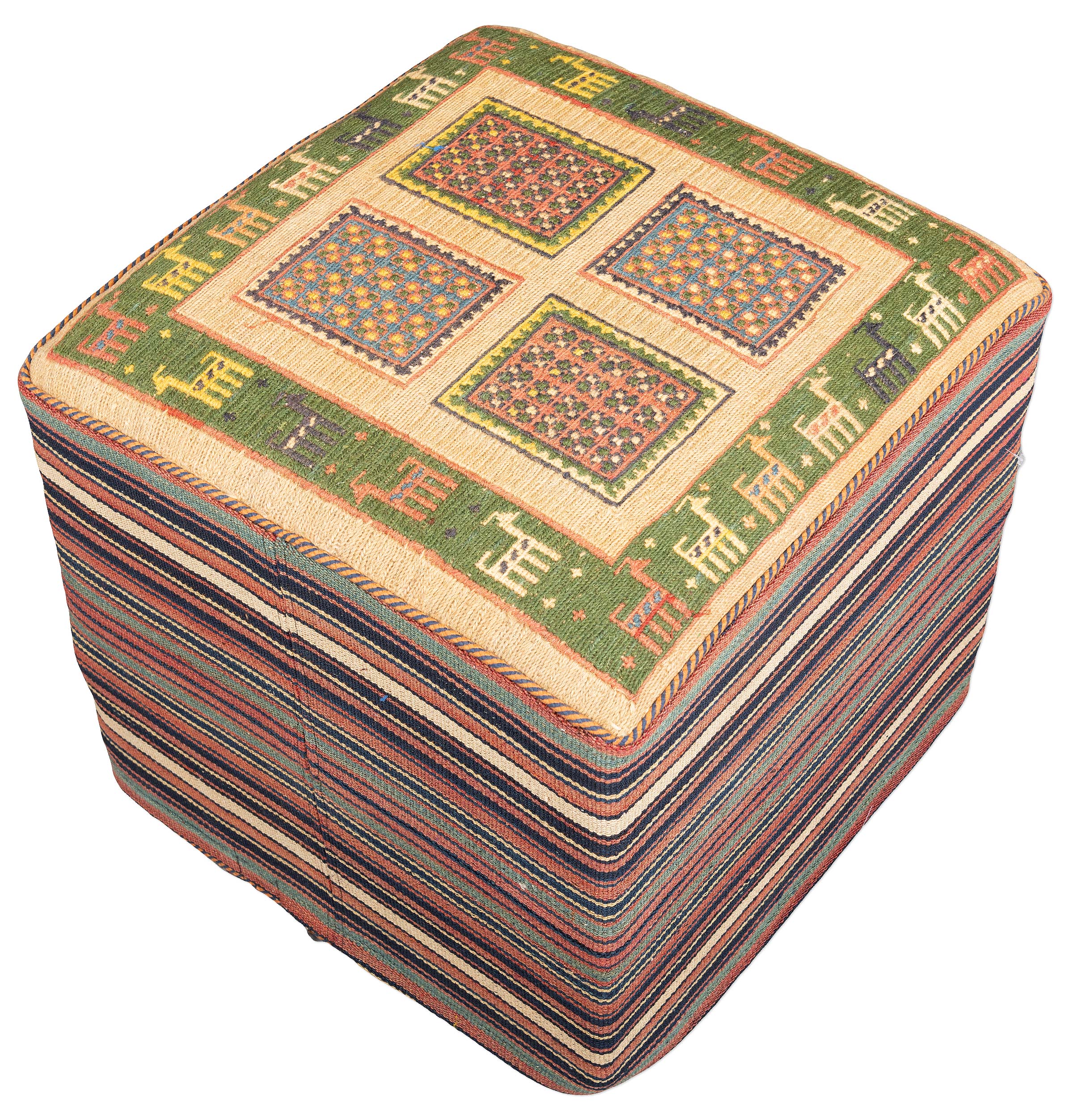 Afschar-Tabii-Sitzwürfel: Entdecken Sie unseren äußerst hochwertigen, vollständig handgemachten und langlebigen Sitzwürfel, der aus echten süd- und nordpersischen Webkelims gefertigt ist. Die Naturfarben und die handversponnene Schafwolle verleihen diesem vielseitig verwendbaren Hocker eine authentische und zeitlose Ausstrahlung. Die Oberseite besteht aus einem faszinierenden Afschar-Tabii-Sumack-Kelim, während alle fünf Seitenteile aus handgemachten alten und antiken Dscha-Dschim-Kelims bestehen (kein ...mehr Infos zur Herkunft