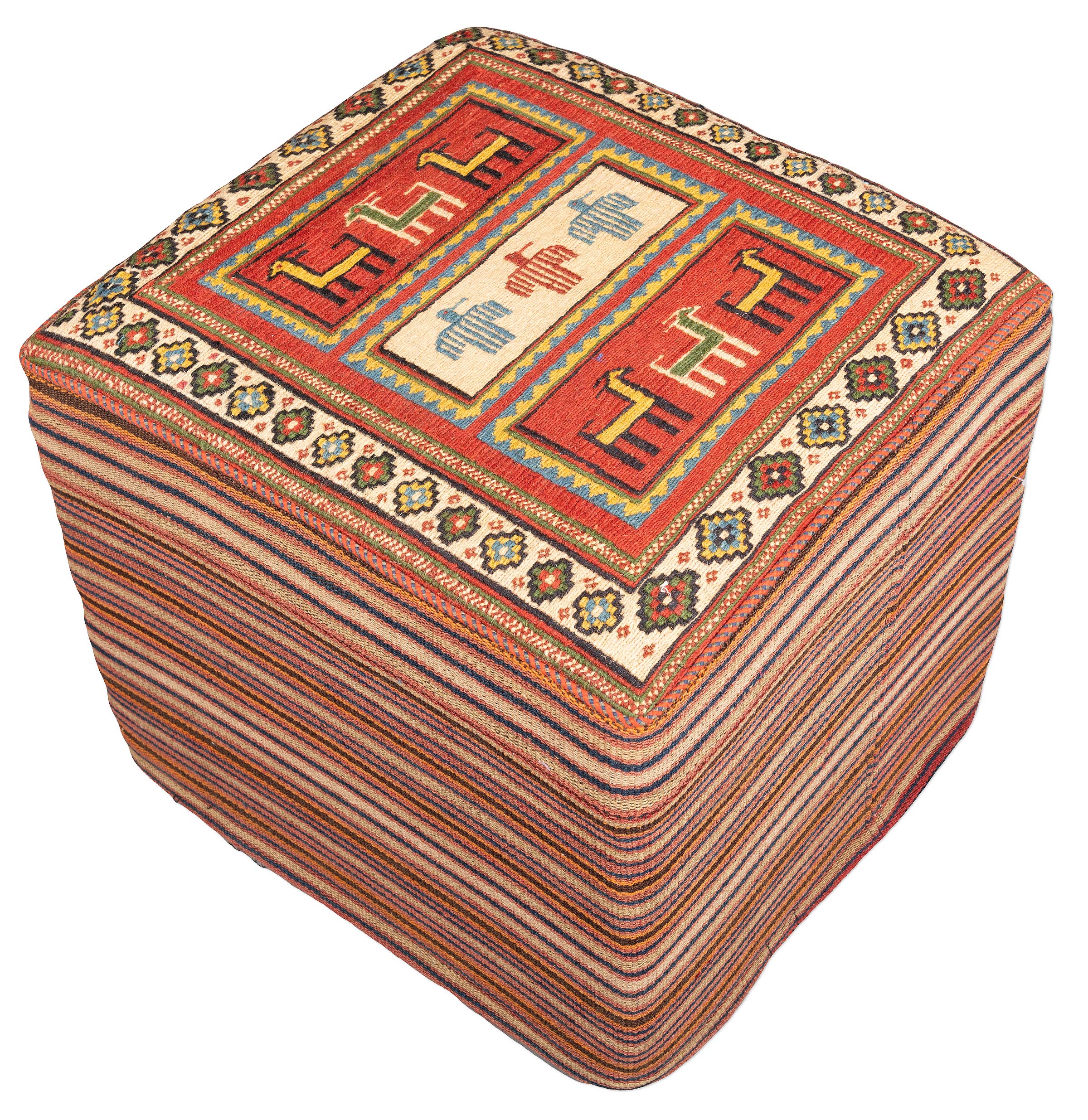 Dieser exquisite Sitzwürfel aus hochwertigem Afschar-Tabii-Sumack-Kelim besticht durch seine leuchtende Hauptfarbe in warmem Rostrot. Die kunstvollen Musterungen in Beige, Blau und Schwarz verleihen dem Design Tiefe und Ausdruckskraft. Ergänzt durch Akzente in sanftem Grün und einem Hauch von fröhlichen, bunten Tönen, entsteht ein harmonisches Gesamtbild, das sowohl traditionell als auch zeitlos wirkt.Die Oberseite des Würfels zeigt ein faszinierendes geometrisches Muster, das von ...