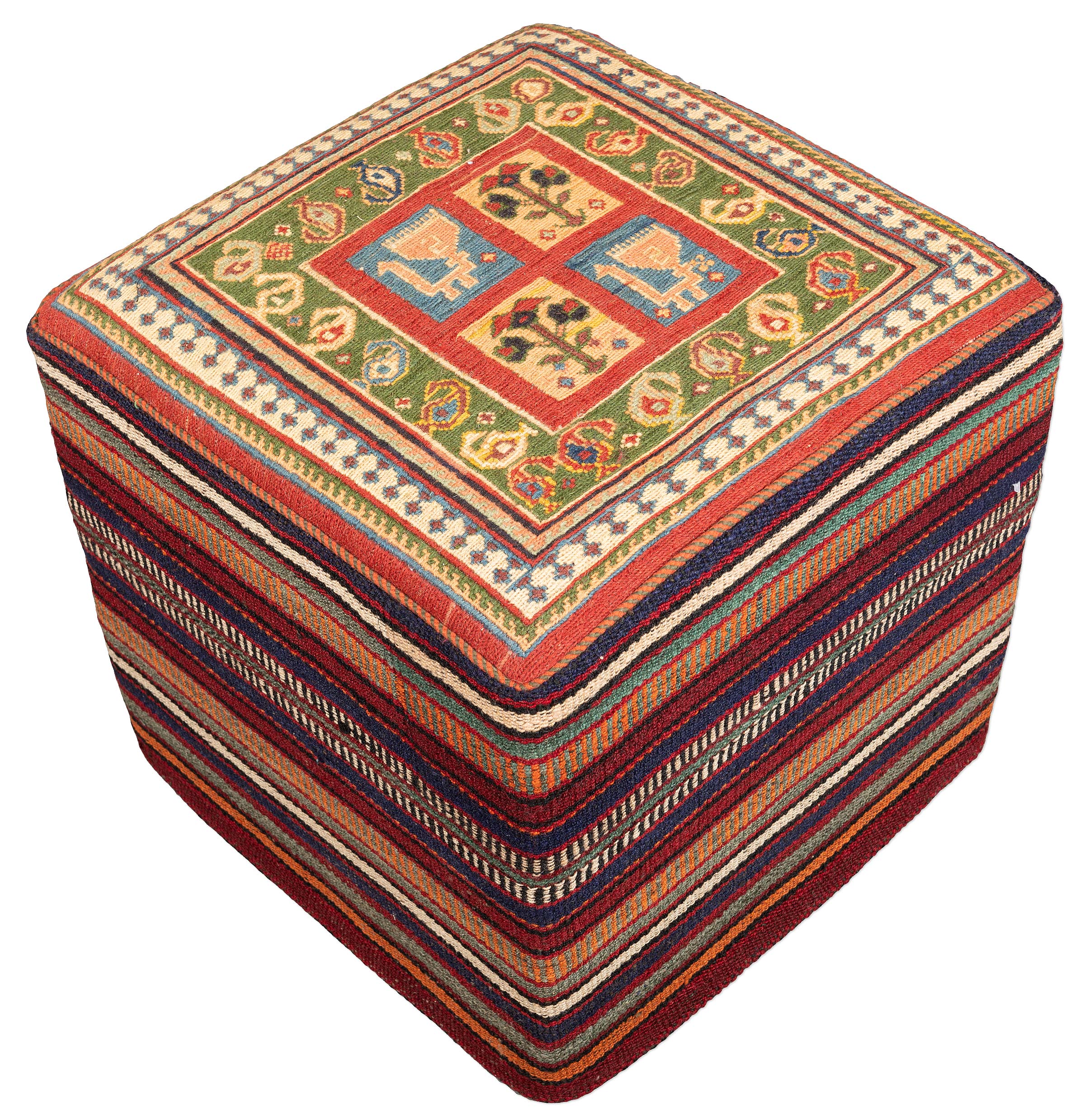 Afschar-Tabii-Sitzwürfel: Entdecken Sie unseren äußerst hochwertigen, vollständig handgemachten und langlebigen Sitzwürfel, der aus echten süd- und nordpersischen Webkelims gefertigt ist. Die Naturfarben und die handversponnene Schafwolle verleihen diesem vielseitig verwendbaren Hocker eine authentische und zeitlose Ausstrahlung. Die Oberseite besteht aus einem faszinierenden Afschar-Tabii-Sumack-Kelim, während alle fünf Seitenteile aus handgemachten alten und antiken Dscha-Dschim-Kelims bestehen (kein ...mehr Infos zur Herkunft