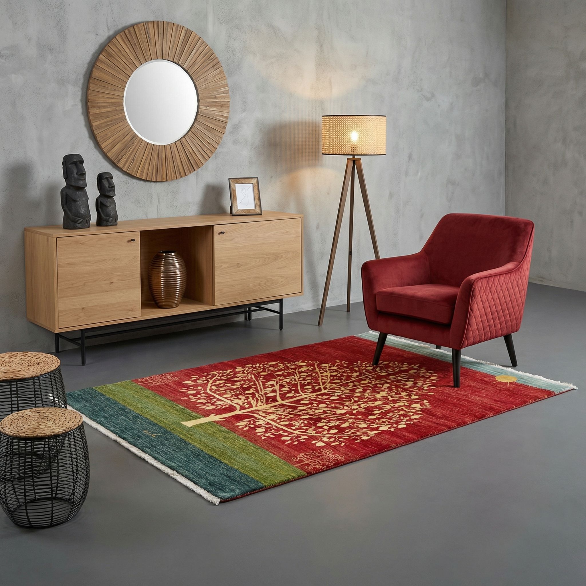 Der Boho-Style lebt von unkonventionellen Farben und lebendigen Mustern, weshalb das kräftige Rot und das ausdrucksstarke Baummotiv dieses Teppichs perfekt in dieses entspannte Wohnkonzept passen. Die künstlerische, fast malerische Darstellung der Naturmotive fügt sich harmonisch in eine Umgebung mit vielen Pflanzen, Rattanmöbeln und weichen Textilien ein. Durch die Herstellung in "Hausfleiß" und die Verwendung rein natürlicher Materialien strahlt der Teppich eine Ungezwungenheit aus, die den kreativen Freigeist des Bohemian-Looks unterstreicht. Er fungiert hier als farbenfroher Ankerpunkt, der Gemütlichkeit ausstrahlt und die Geschichte ferner Länder erzählt.