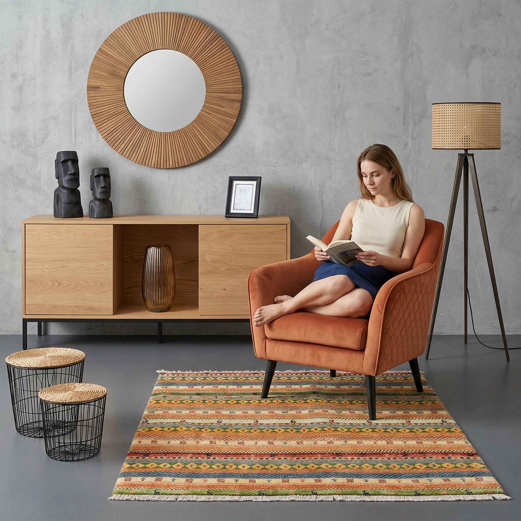 Der Teppich passt hervorragend zum Boho-Style, da dieser Einrichtungsstil von lebendigen Farben, Mustern und einer unkonventionellen Lässigkeit lebt. Die bunten Streifen und die Vielfalt an geometrischen sowie figürlichen Motiven fügen sich perfekt in ein Interieur ein, das verschiedene Texturen und kulturelle Einflüsse mixt. Dank der Verwendung von Naturfarben und handversponnener Wolle strahlt der Teppich genau jene natürliche Unvollkommenheit und Gemütlichkeit aus, die im Bohème-Wohnen gewünscht ist. Er bietet die ideale Grundlage für ein kreatives Zuhause voller Pflanzen, Rattanmöbel und individueller Sammlerstücke.