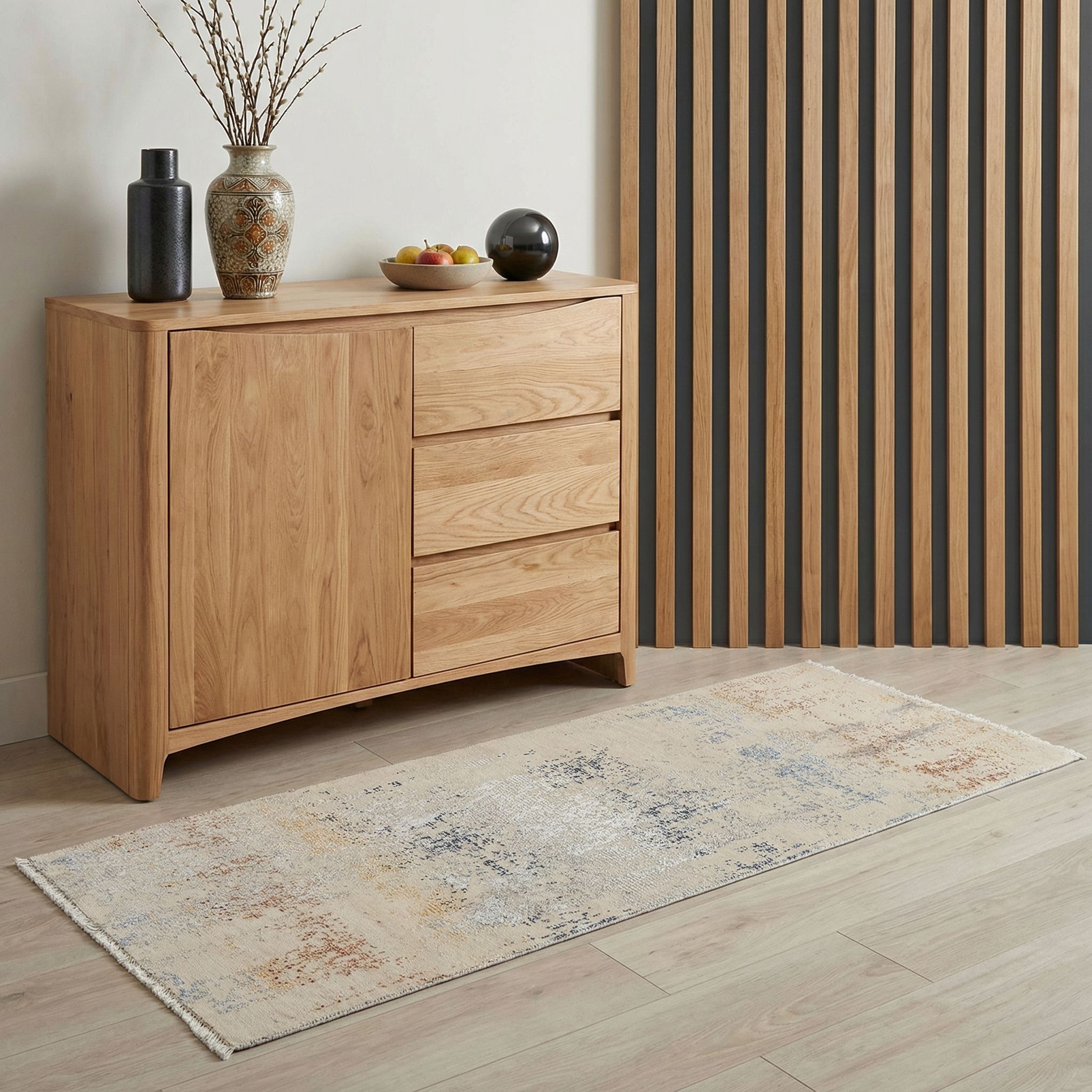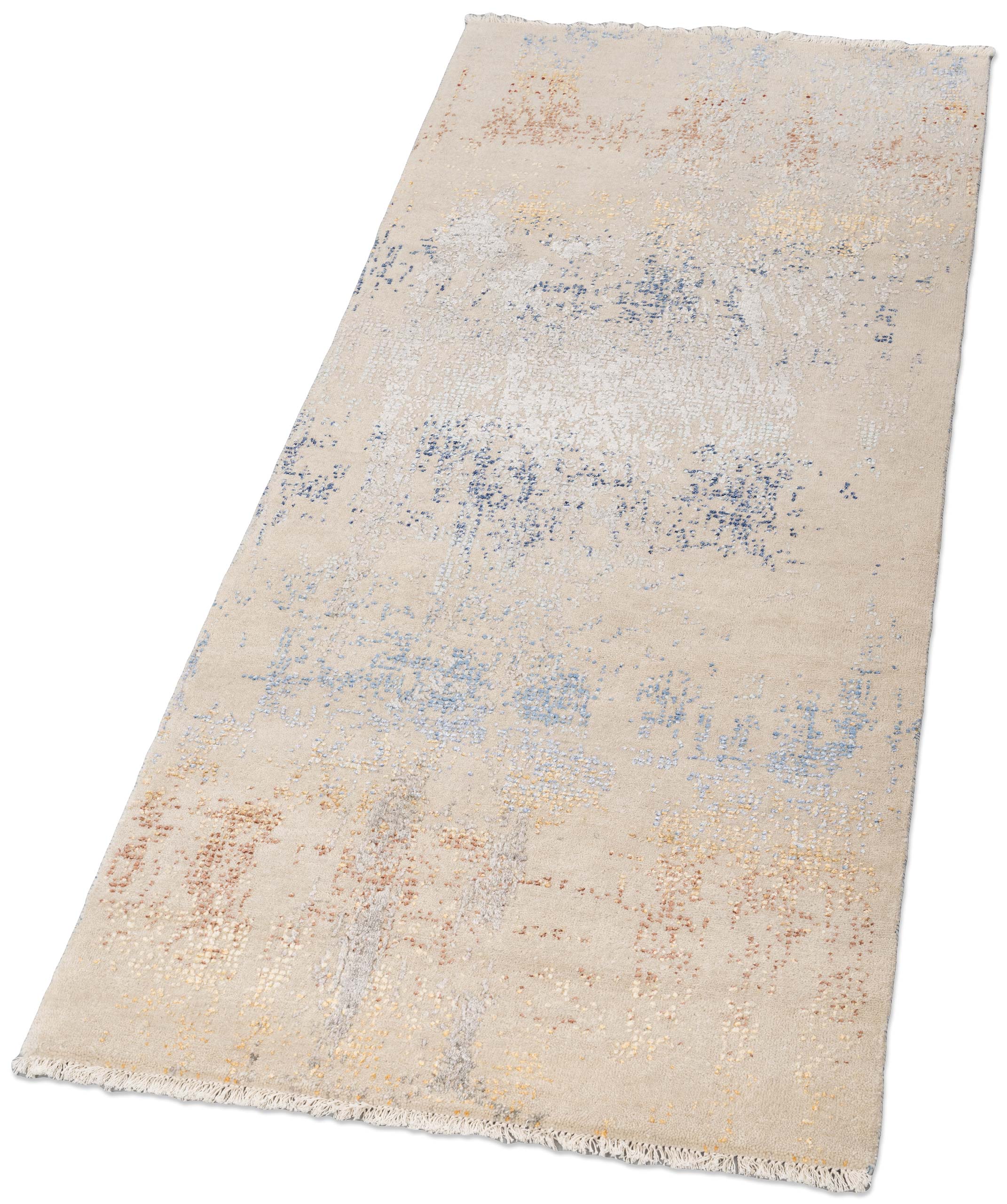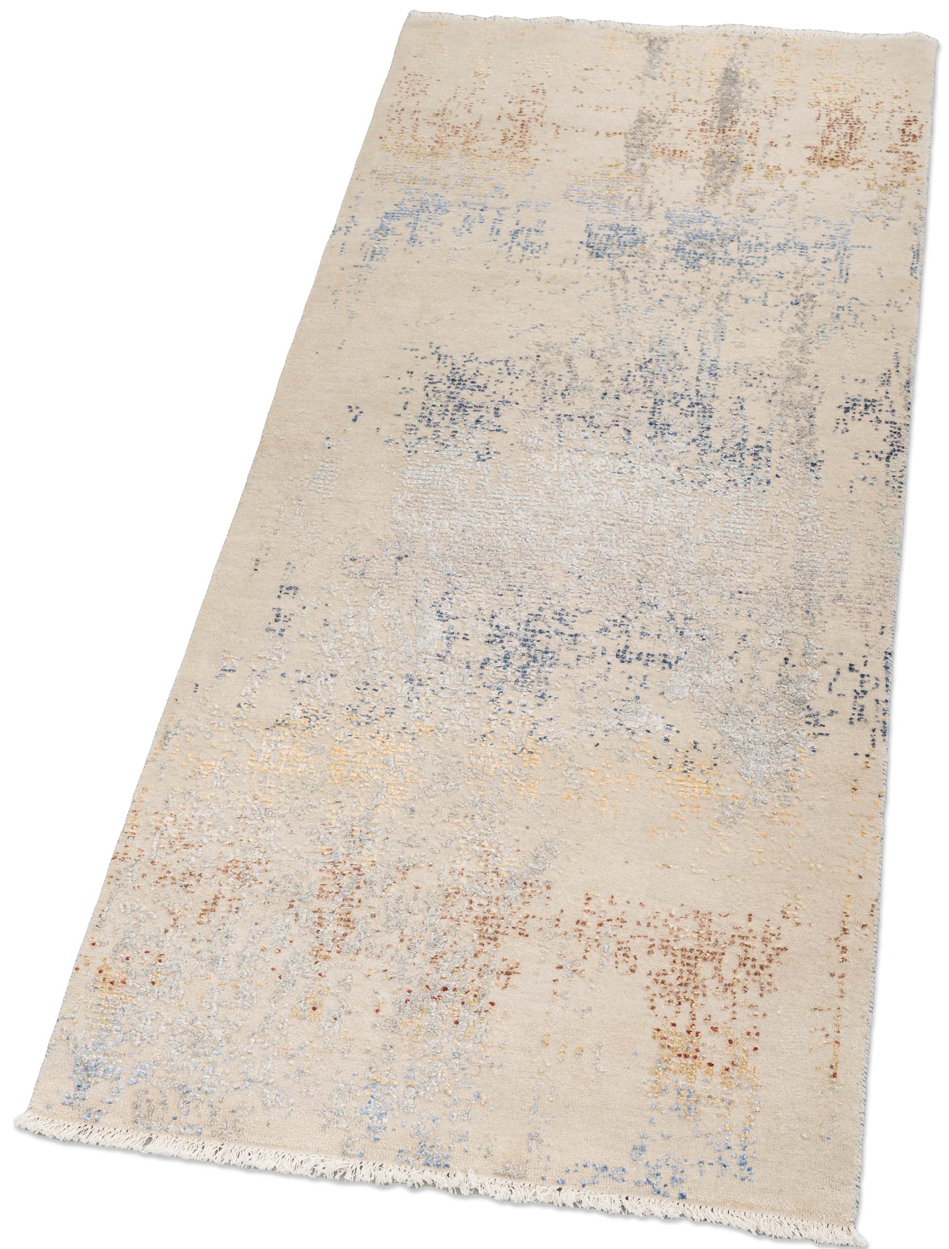 Dieser handgeknüpfte Teppich aus Indien, bekannt als Eterno, besticht durch seine edle, cremefarbene Hauptfarbe, die eine warme und einladende Atmosphäre schafft. Ergänzt wird dieses harmonische Farbspiel durch sanfte Blautöne und ein gedämpftes Rostrot, die in einem modernen, abstrakten Muster angeordnet sind. Diese farbenfrohe Komposition verleiht dem Teppich einen fröhlichen und gleichzeitig eleganten Charakter. Der Teppich ist aus handgekämmter Schafwolle und feiner Bambusseide ...mehr Beschreibung