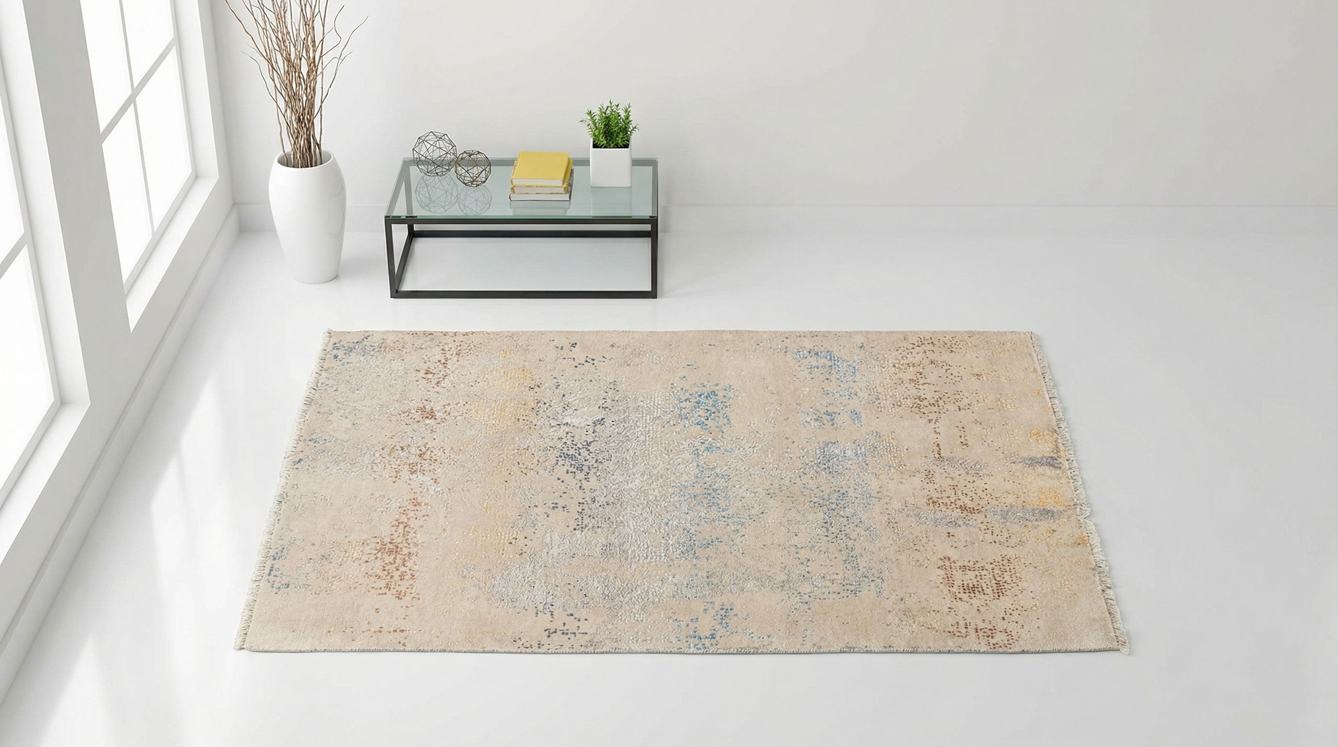 Dieser handgeknüpfte Teppich aus Indien, Modell Eterno, besticht durch seine sanfte Hauptfarbe in Beige. Akzente in leuchtendem Gelb und dezentem Blau verleihen ihm eine lebendige, doch harmonische Farbgebung. Das Muster wirkt abstrakt und modern, mit einer leichten Vintage-Anmutung, die durch den unregelmäßigen Farbverlauf erreicht wird.Jedes Detail dieses Teppichs ist von höchster Qualität: Handkardierte Schafwolle kombiniert mit glänzender Bambusseide sorgt für eine ...