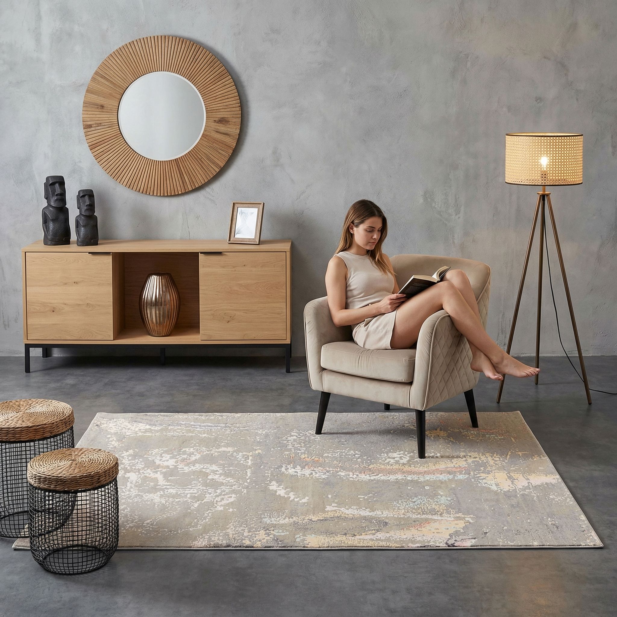 In einem rauen Loft-Ambiente mit Sichtbeton, Ziegelwänden und Metall fungiert dieser Teppich als gekonnter Weichzeichner und edler Stilbruch. Die graue Grundtönung greift den industriellen Look perfekt auf, während die pastelligen Einsprengsel und der seidige Glanz einen spannenden, luxuriösen Kontrast zur kühlen Architektur bilden. Durch den modernen Vintage-Look und die unregelmäßige Struktur der Naturmaterialien wirkt das Stück authentisch und nimmt dem Raum die Strenge, ohne den maskulinen Charakter zu verlieren. So verwandelt der Teppich eine kühle Fabrikatmosphäre in einen wohnlichen Rückzugsort mit individueller Note.