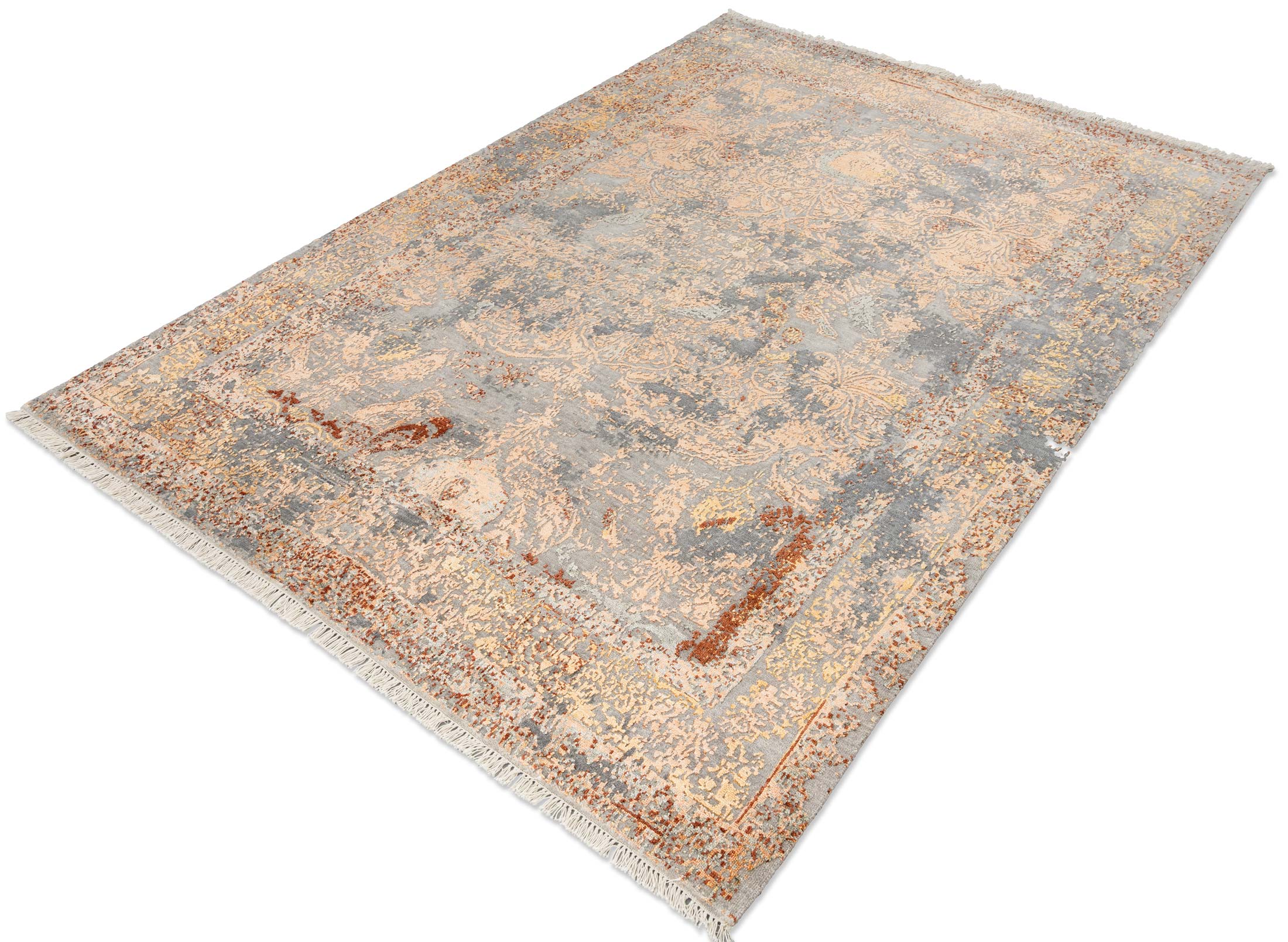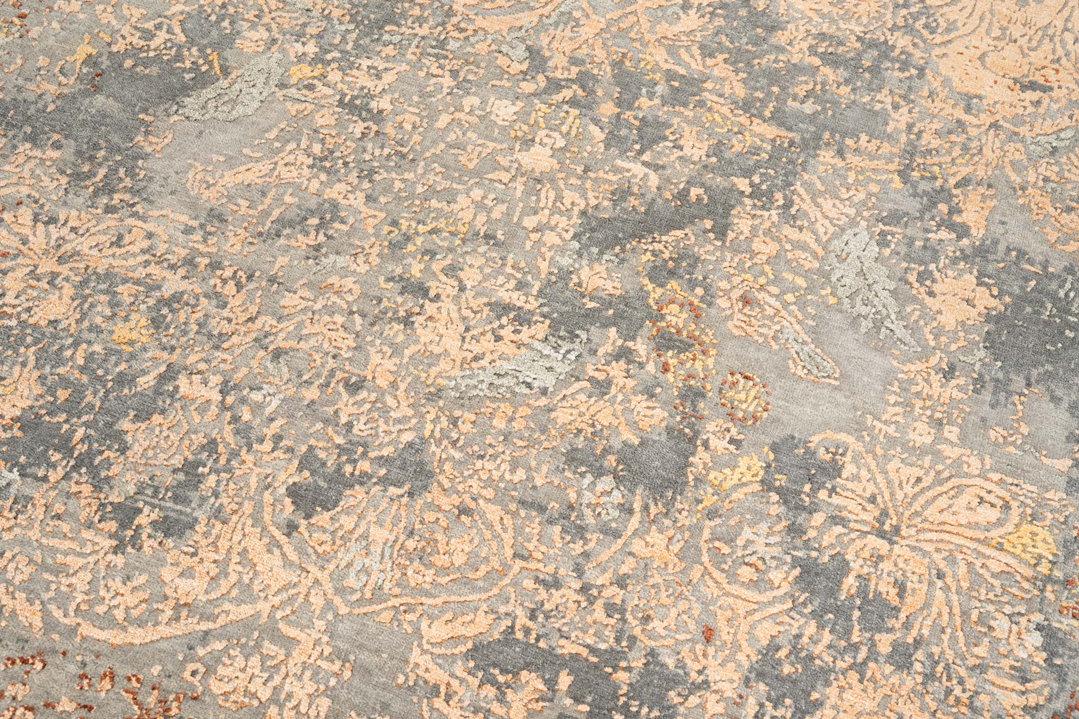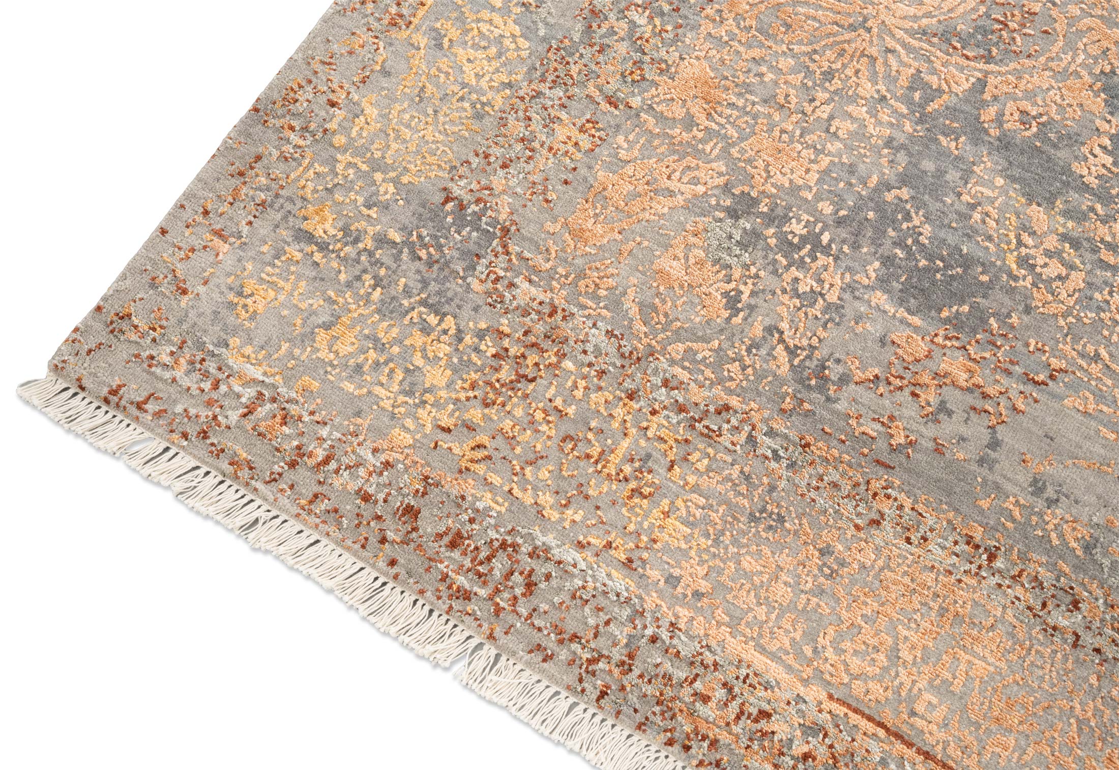 Dieser exquisite handgeknüpfte Teppich aus der Eterno-Kollektion besticht durch seine dominierende graue Hauptfarbe, die ihm eine zeitlose Eleganz verleiht. Ergänzt wird das Design durch warme Beige-Töne, die dem Teppich eine subtile Tiefe und Harmonie verleihen. Akzente in sanftem Rostbraun durchziehen das Muster und sorgen für interessante visuelle Kontraste. Die Musterung ist eine kunstvolle Mischung aus floralen und geometrischen Elementen, die durch den von Hand gearbeiteten ...mehr Beschreibung