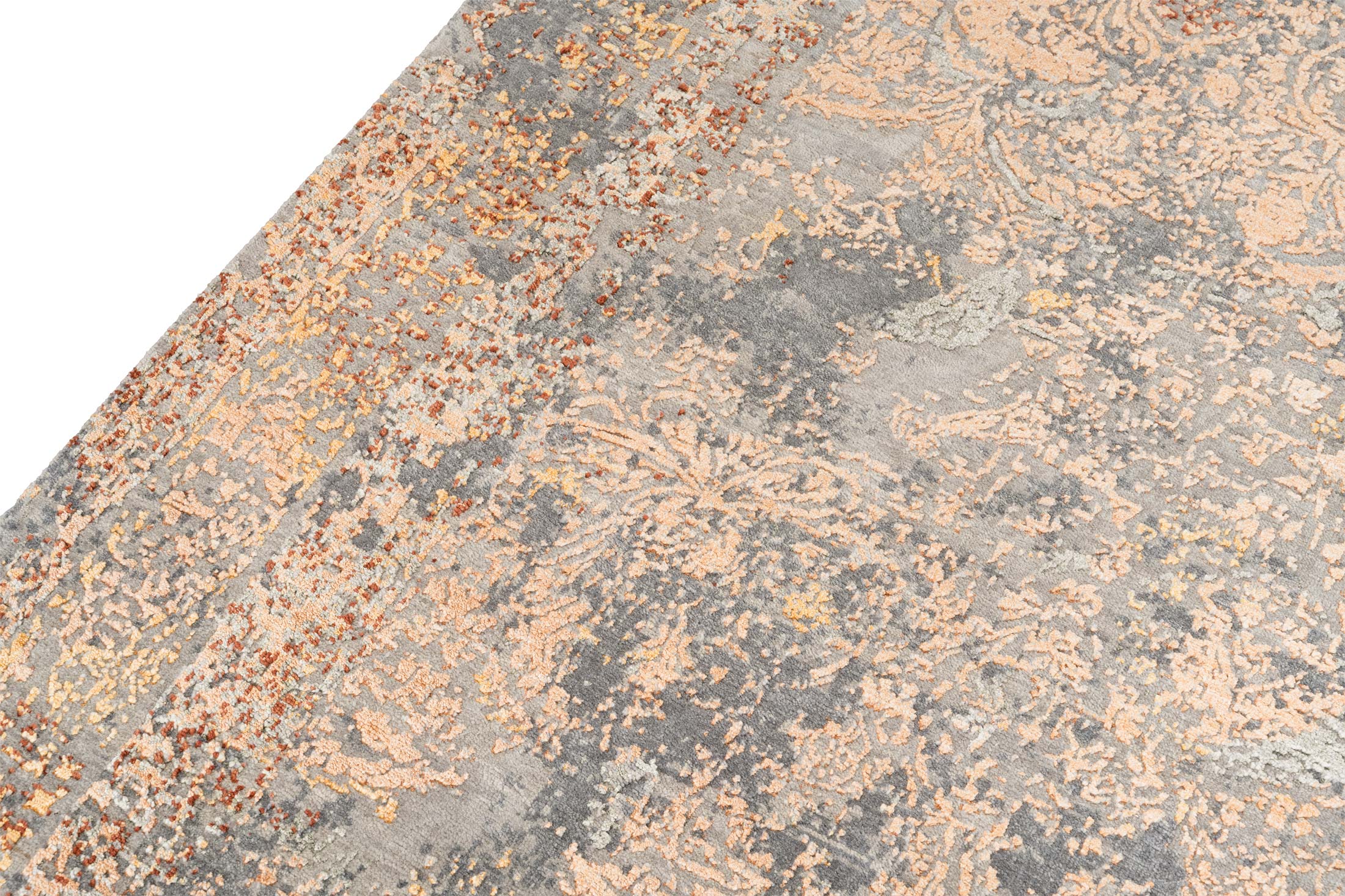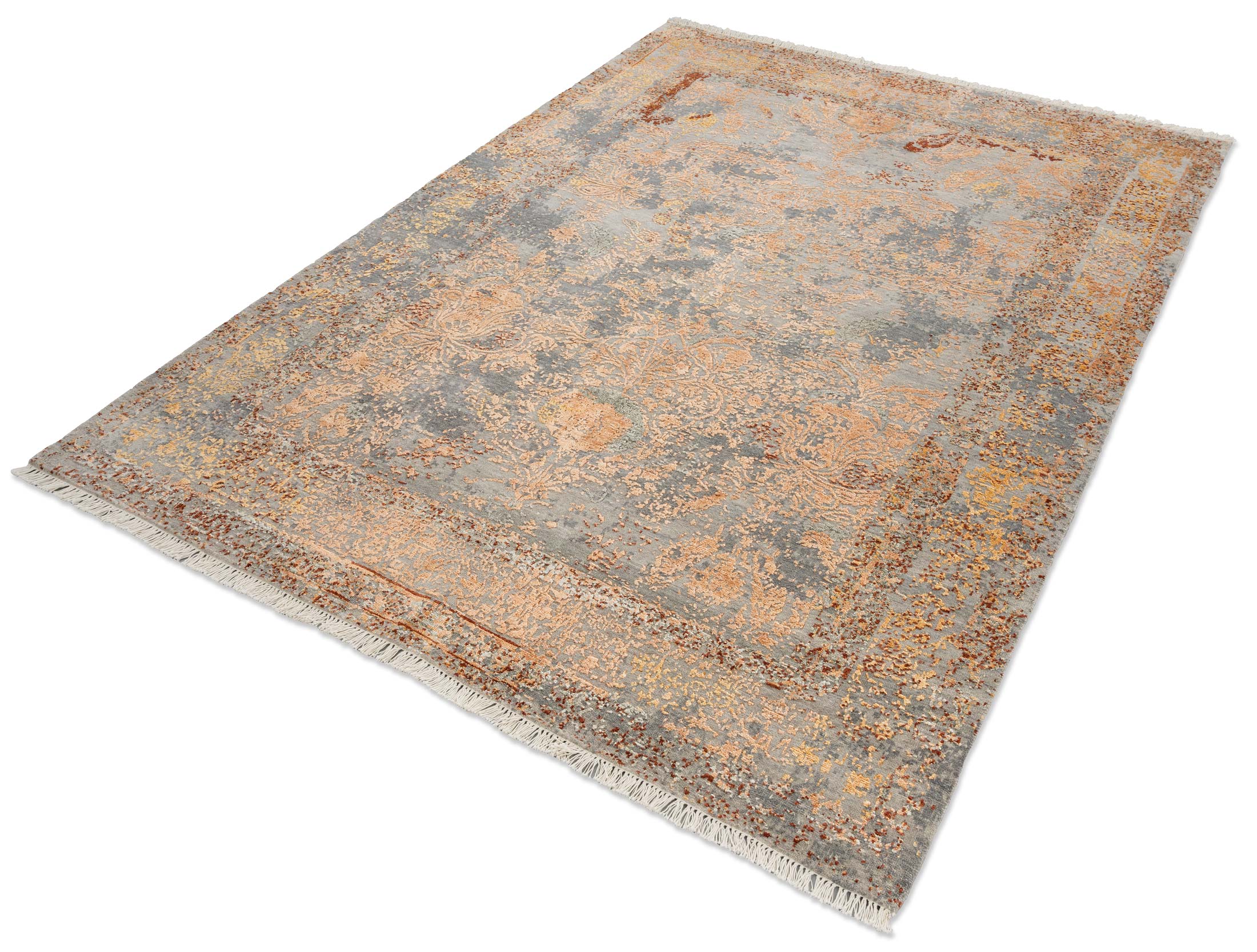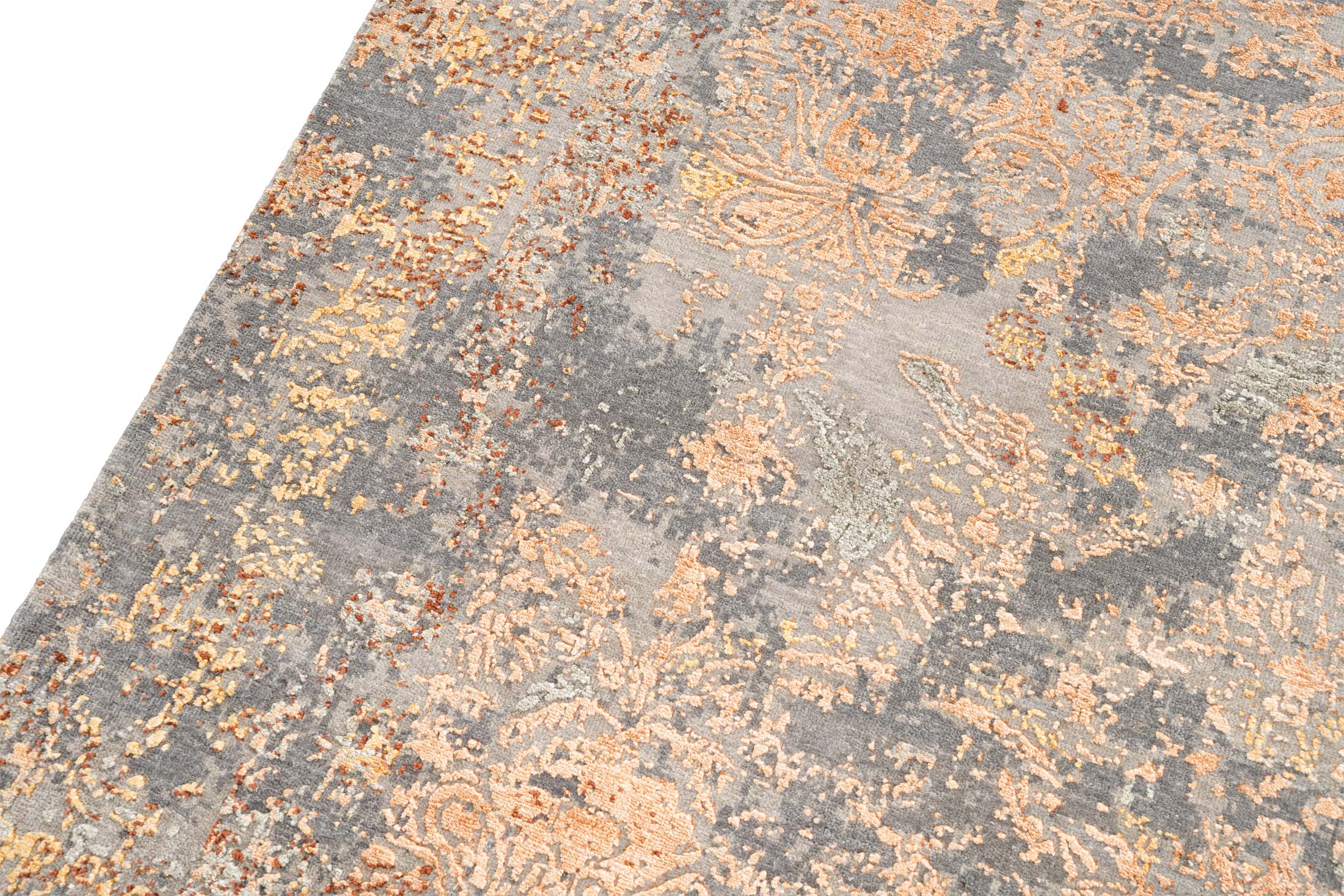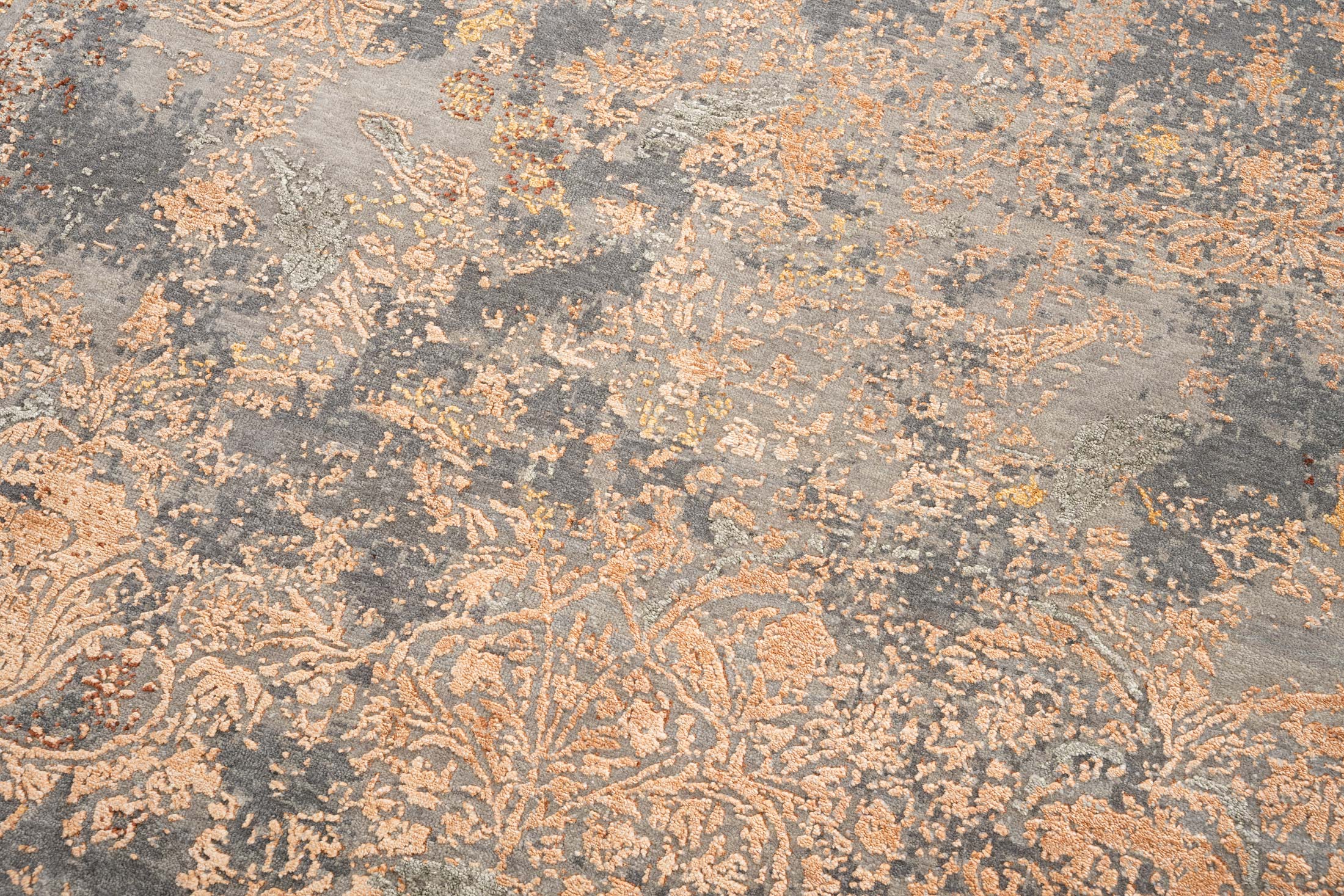 Dieser exquisite handgeknüpfte Teppich aus der Eterno-Kollektion besticht durch seine dominierende graue Hauptfarbe, die ihm eine zeitlose Eleganz verleiht. Ergänzt wird das Design durch warme Beige-Töne, die dem Teppich eine subtile Tiefe und Harmonie verleihen. Akzente in sanftem Rostbraun durchziehen das Muster und sorgen für interessante visuelle Kontraste. Die Musterung ist eine kunstvolle Mischung aus floralen und geometrischen Elementen, die durch den von Hand gearbeiteten ...mehr Beschreibung
