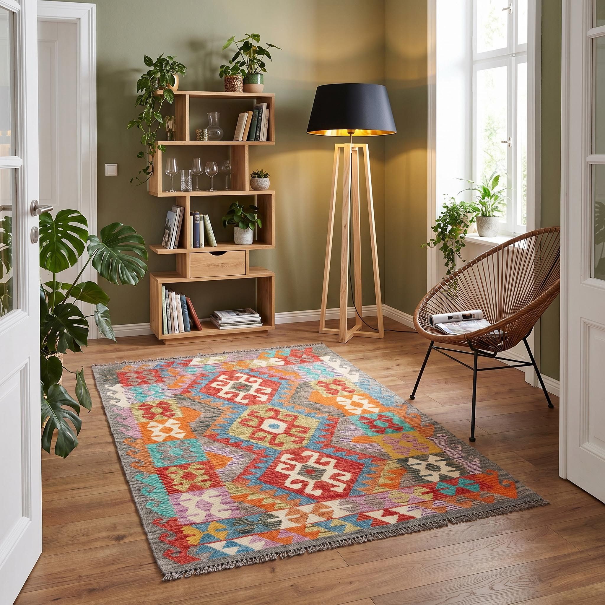 In der kühlen Klarheit des skandinavischen Designs wirkt dieser Kelim als wärmender Anker, der für die nötige Portion „Hygge“ sorgt. Die geometrischen Muster fügen sich nahtlos in die nordische Formensprache ein, während die bunten Naturfarben einen fröhlichen, aber nicht zu grellen Kontrast zu viel Weiß und hellem Holz bilden. Da im Skandi-Style natürliche Materialien oberste Priorität haben, überzeugt dieses Unikat durch seine reine Schurwolle und die nachhaltige Herstellung im Hausfleiß. So verleihen Sie Ihrem nordischen Zuhause eine persönliche Note, die Designbewusstsein mit gemütlicher Wohnlichkeit vereint.