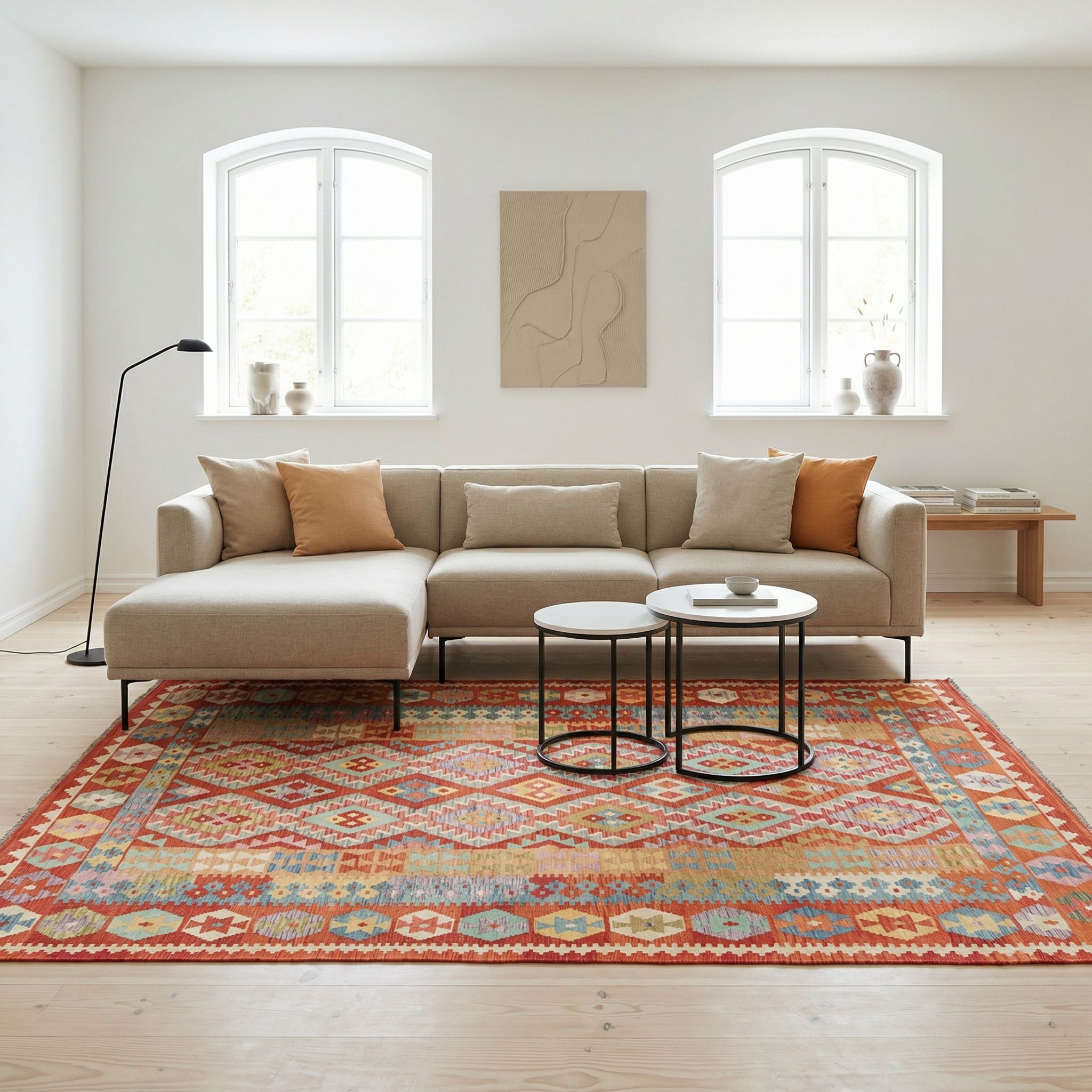 Entdecken Sie den faszinierenden Ghazghar-Kelim, dessen Hauptfarbe ein warmes Rot ist, ergänzt durch sanfte Beigetöne und lebhaftes Blau. Die Musterung ist reich an traditionellen, geometrischen Formen, die an die alten Nomadenkulturen Afghanistans erinnern. Dieser handgewebte Schlitzkelim ist aus handversponnener Schafwolle gefertigt und mit Naturfarben gefärbt, was ihm eine einzigartige, lebendige Ausstrahlung verleiht. Seine beidseitige Verwendbarkeit macht ihn ebenso vielseitig wie ...mehr Beschreibung