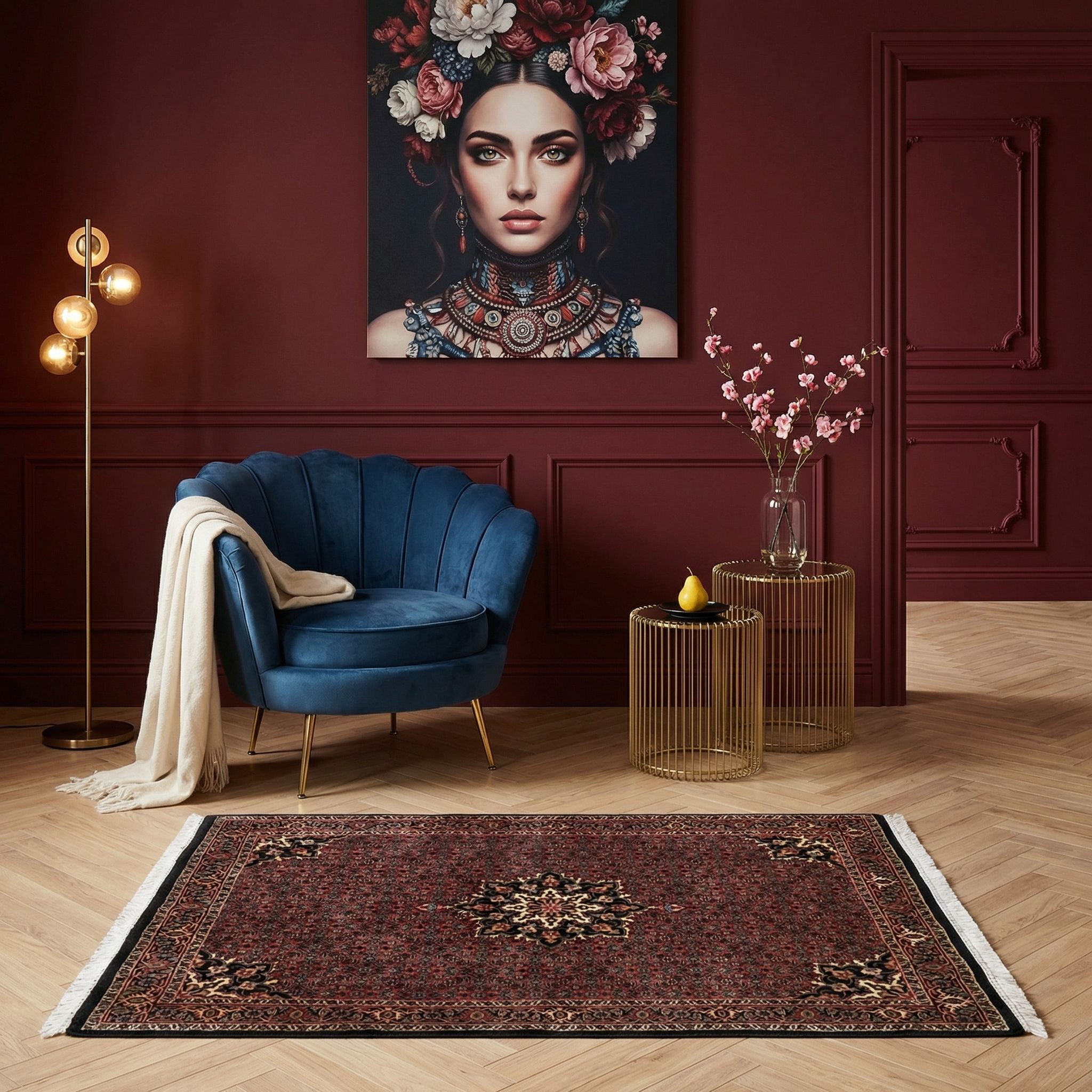 Dieser handgeknüpfte Bidjar-Teppich aus Persien besticht durch seine Hauptfarbe, ein tiefes Rostrot, das dem Raum Wärme verleiht. Die kunstvolle Musterung wird durch Akzente in Beige, Schwarz und Blau ergänzt, die dem Teppich eine elegante und zeitlose Ästhetik verleihen. Besonders hervorzuheben ist das zentrale Medaillon, das durch seine komplexe Gestaltung und harmonische Farbgebung besticht.Die aufwendige Knotendichte von ca. 560.000 Knoten pro Quadratmeter unterstreicht die hohe ...