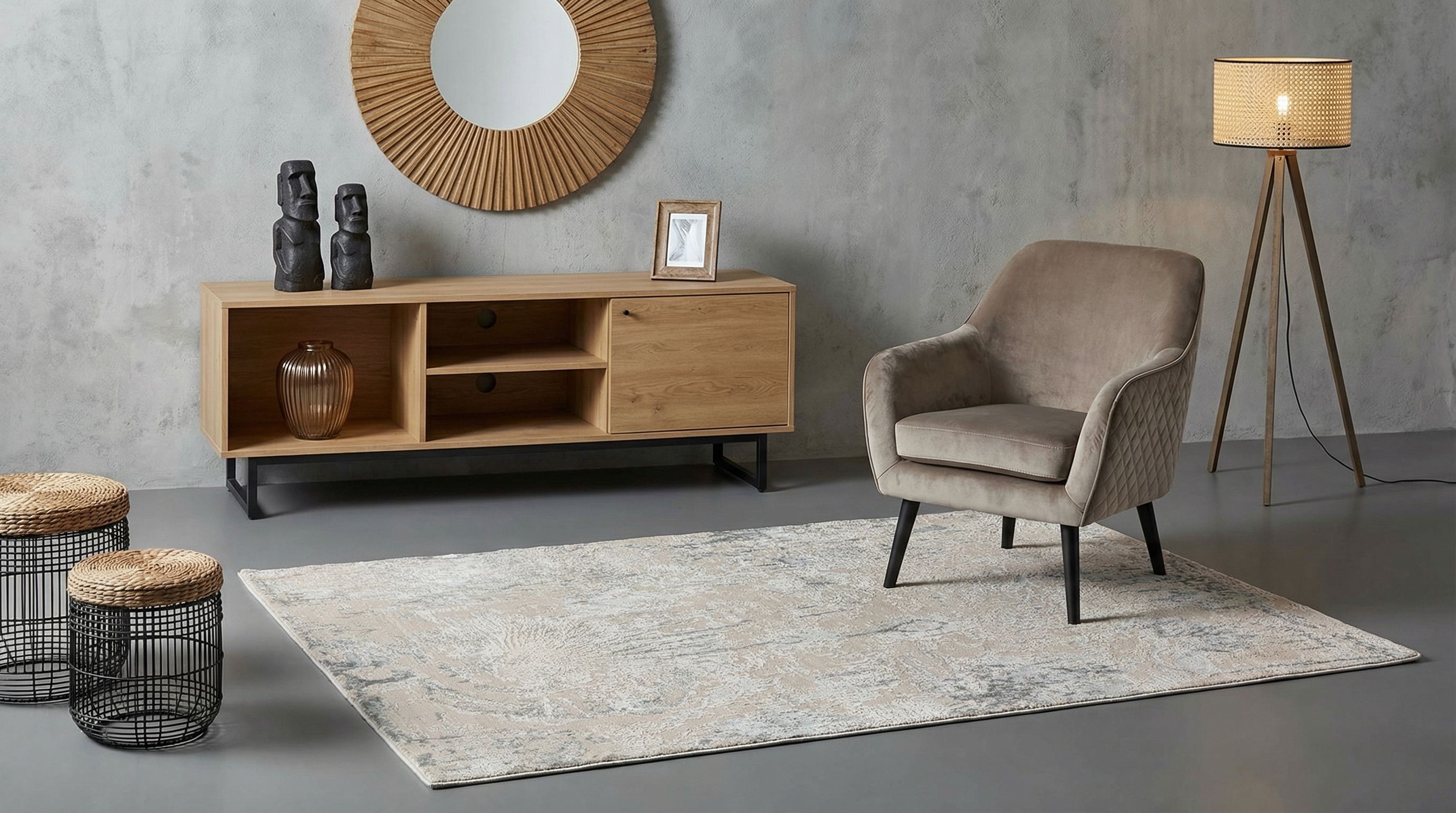 Dieser handgeknüpfte Teppich aus der Eterno-Kollektion besticht durch seine elegante Farbgebung und das raffinierte Design. Die Hauptfarbe ist ein sanftes Beige, das eine warme und einladende Atmosphäre schafft. Akzentuiert wird dieser Grundton durch subtile Grautöne, die dem Teppich eine faszinierende Tiefe verleihen. Ein Hauch von zartem Blau ergänzt das Ensemble und sorgt für eine harmonische Ausstrahlung. Das Muster ist abstrakt und wirkt modern und ansprechend, wobei es perfekt die ...mehr Beschreibung