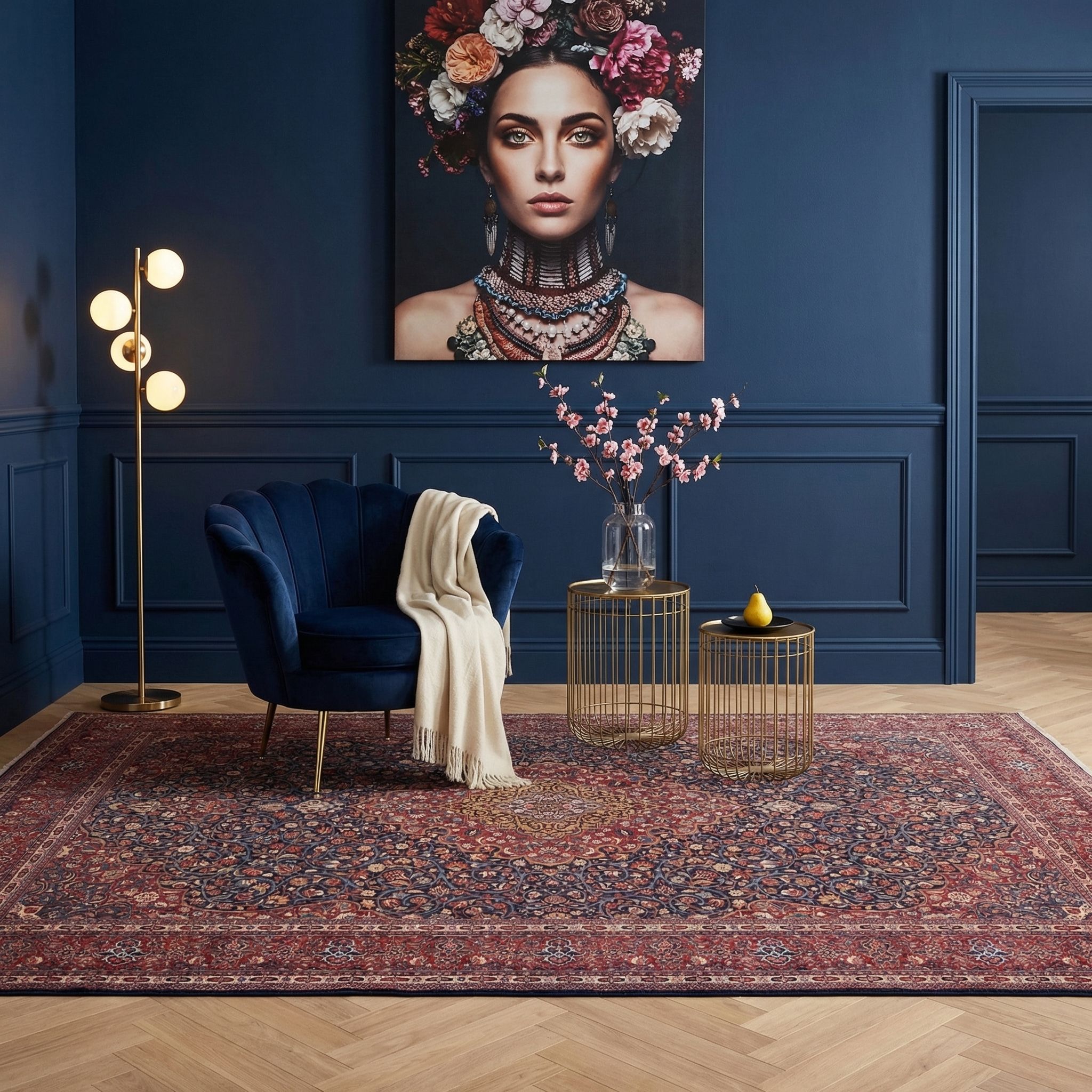 In einem modernen Wohnkonzept dient dieser Teppich als spektakulärer Stilbruch, der als seelenvoller Anker inmitten von cleanen Linien und minimalistischem Design wirkt. Die lebendigen Pflanzenfarben und das komplexe Medallion-Muster brechen die Strenge zeitgenössischer Architektur auf und verwandeln den Boden in eine Galerie für Textilkunst. Seine tiefe Geschichte und handwerkliche Meisterschaft bieten einen warmen, greifbaren Kontrapunkt zu glatten Oberflächen wie Glas oder Lack. Dieser Gaswin beweist, dass wahre Modernität im kuratierten Dialog zwischen dem schlichten Neuen und dem kostbaren Alten liegt.