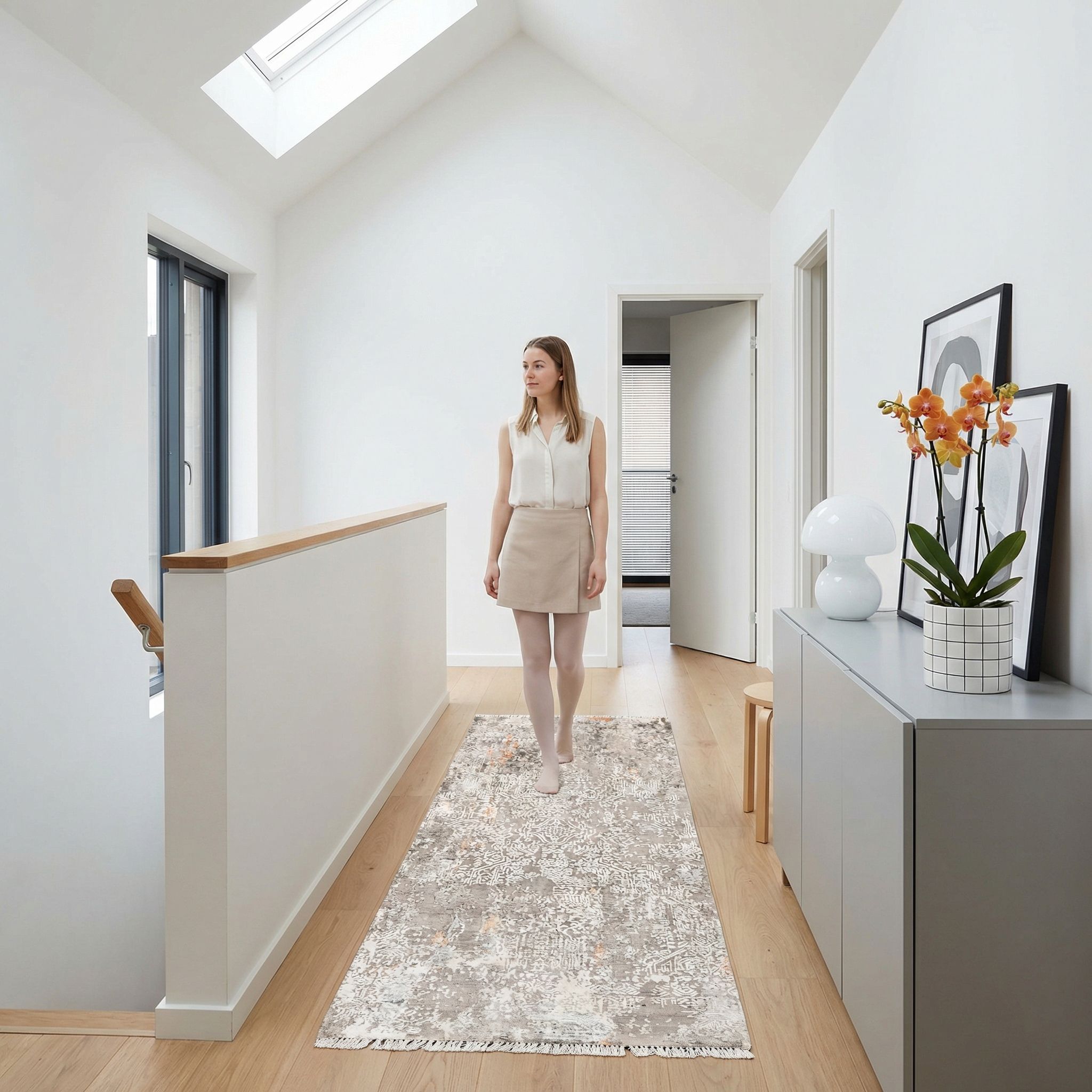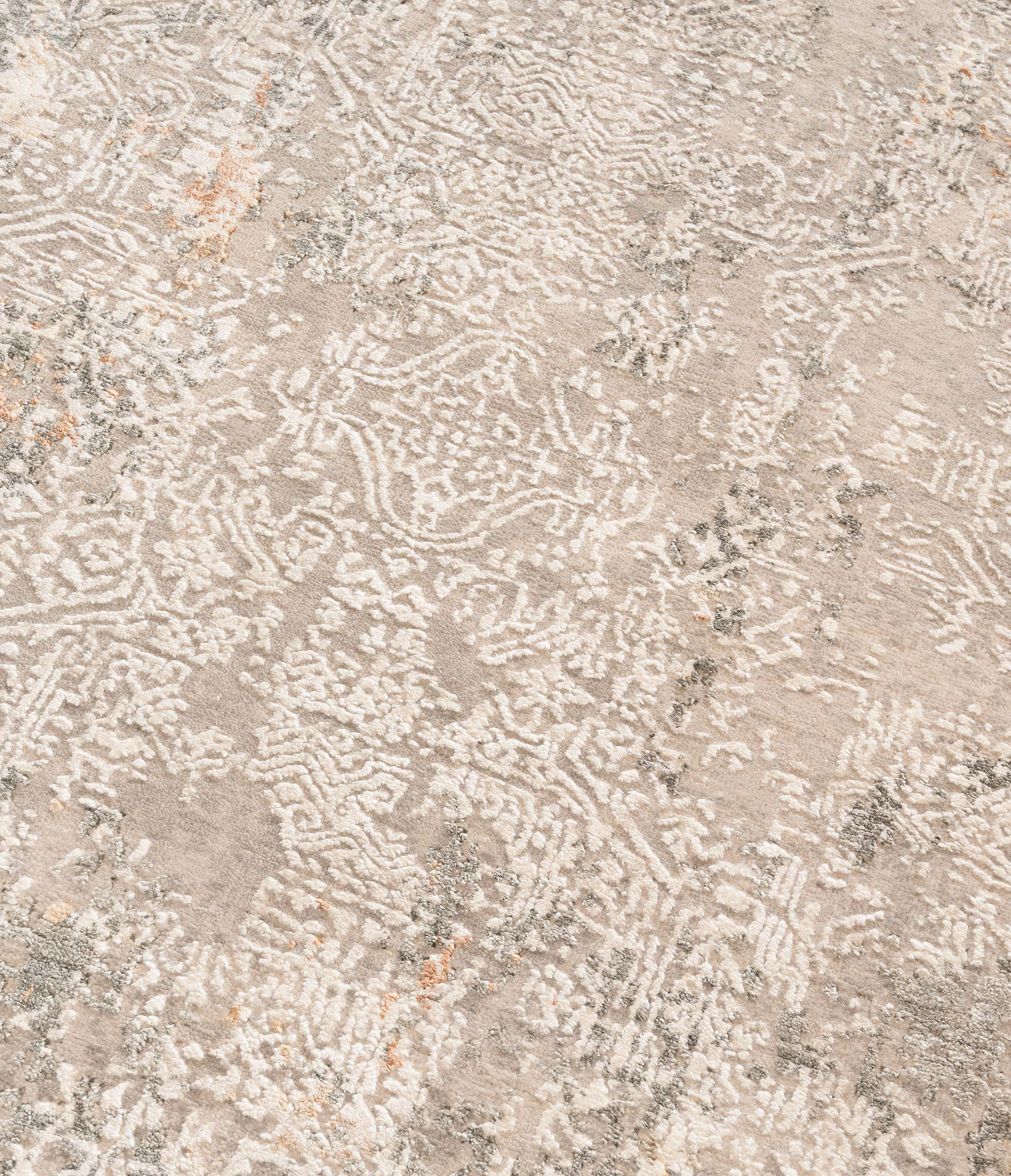 Der Eterno-Teppich aus Indien präsentiert sich in einem eleganten, neutralen Beige als Hauptfarbe, das eine beruhigende Grundstimmung schafft. Akzente in hellem Grau und sanftem Weiß durchziehen das Design und verleihen dem Teppich eine ansprechende Struktur. Das Muster ist komplex und wirkt durch den Einsatz von persischen Knoten besonders fein und detailliert. Der handgearbeitete Reliefschnitt hebt das moderne, aber dennoch zeitlose Design hervor. Das Stück besteht aus handgekardeter ...mehr Beschreibung