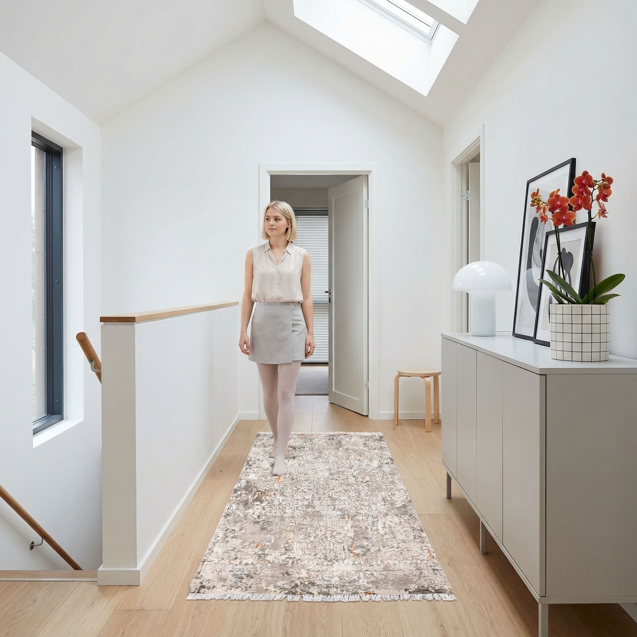 Dieser handgeknüpfte Teppich aus Indien, bekannt als "Eterno", präsentiert sich in einer eleganten Farbpalette. Die Hauptfarbe ist ein sanftes Beige, das dem Teppich eine warme und einladende Ausstrahlung verleiht. Dazu gesellen sich Akzente in einem subtilen Grau, die für eine harmonische Balance sorgen. Kleine Einsprengsel von einem leuchtenden Orange setzen lebendige Akzente und verleihen dem Design eine fröhliche Note. Das Muster ist komplex und detailreich, mit einem modernen, ...mehr Beschreibung