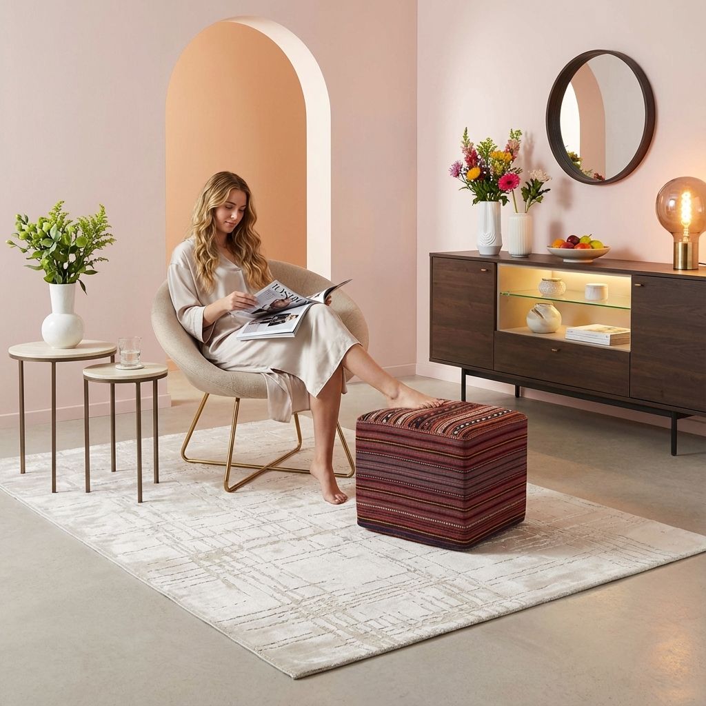 In einem reduzierten Contemporary-Ambiente fungiert dieser kunstvolle Sitzwürfel als raffinierter "Stilbruch" und wärmender Blickfang. Die archaischen Muster und die tiefe, natürliche Farbigkeit bilden einen spannenden, hochwertigen Kontrast zu klaren Linien, glatten Oberflächen und kühlem Design. Er bricht die Strenge moderner Architektur auf und verleiht dem Raum sofort eine kultivierte, wohnliche Tiefe, ohne ihn zu überladen. Dieses formstabile Möbelstück beweist eindrucksvoll, dass uralte, meisterhafte Handwerkskunst perfekt mit zeitgenössischem Ästhetikempfinden harmoniert.