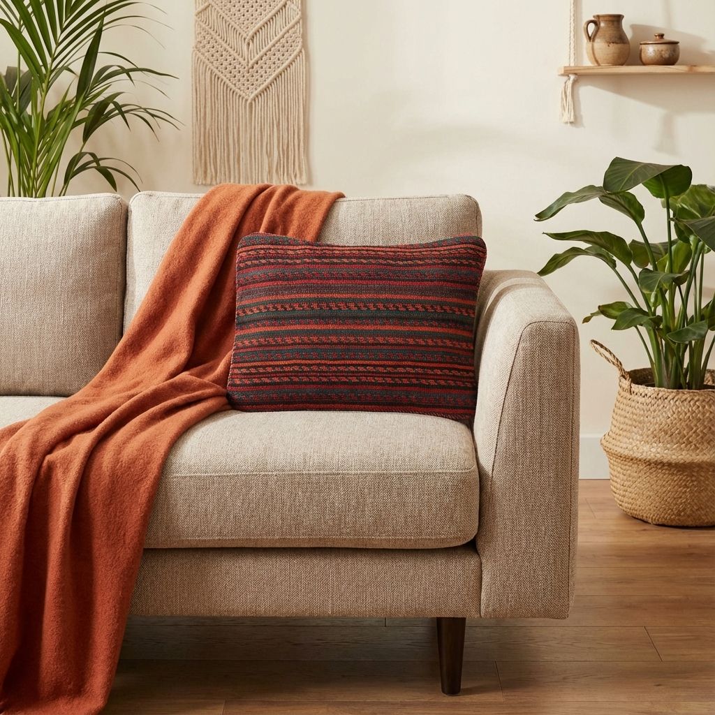 In einem reduzierten, modernen Ambiente fungiert dieses kunstvolle Kissen als raffinierter, wärmender Akzent, der die Brücke zwischen Tradition und Moderne schlägt. Das markante geometrische Rautenmuster wirkt zeitlos und bricht die Strenge minimalistischer Designermöbel gekonnt auf, ohne den klaren Look zu überladen. Die wundervoll warme Farbpalette verleiht kühlen, glatten Oberflächen sofort eine wohnliche Tiefe und eine hochwertige haptische Dimension. Es beweist eindrucksvoll, dass uralte Handwerkskunst perfekt in ein zeitgemäßes, designorientiertes Wohnambiente passt.