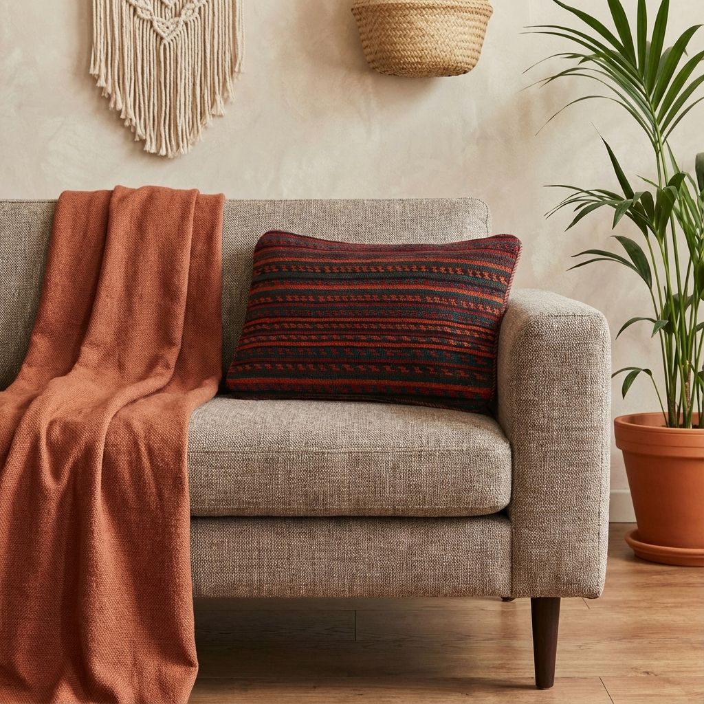 In einem reduzierten, modernen Ambiente fungiert dieses kunstvolle Kissen als raffinierter, wärmender Akzent, der die Brücke zwischen Tradition und Moderne schlägt. Das markante geometrische Rautenmuster wirkt zeitlos und bricht die Strenge minimalistischer Designermöbel gekonnt auf, ohne den klaren Look zu überladen. Die wundervoll warme Farbpalette verleiht kühlen, glatten Oberflächen sofort eine wohnliche Tiefe und eine hochwertige haptische Dimension. Es beweist eindrucksvoll, dass uralte Handwerkskunst perfekt in ein zeitgemäßes, designorientiertes Wohnambiente passt.
