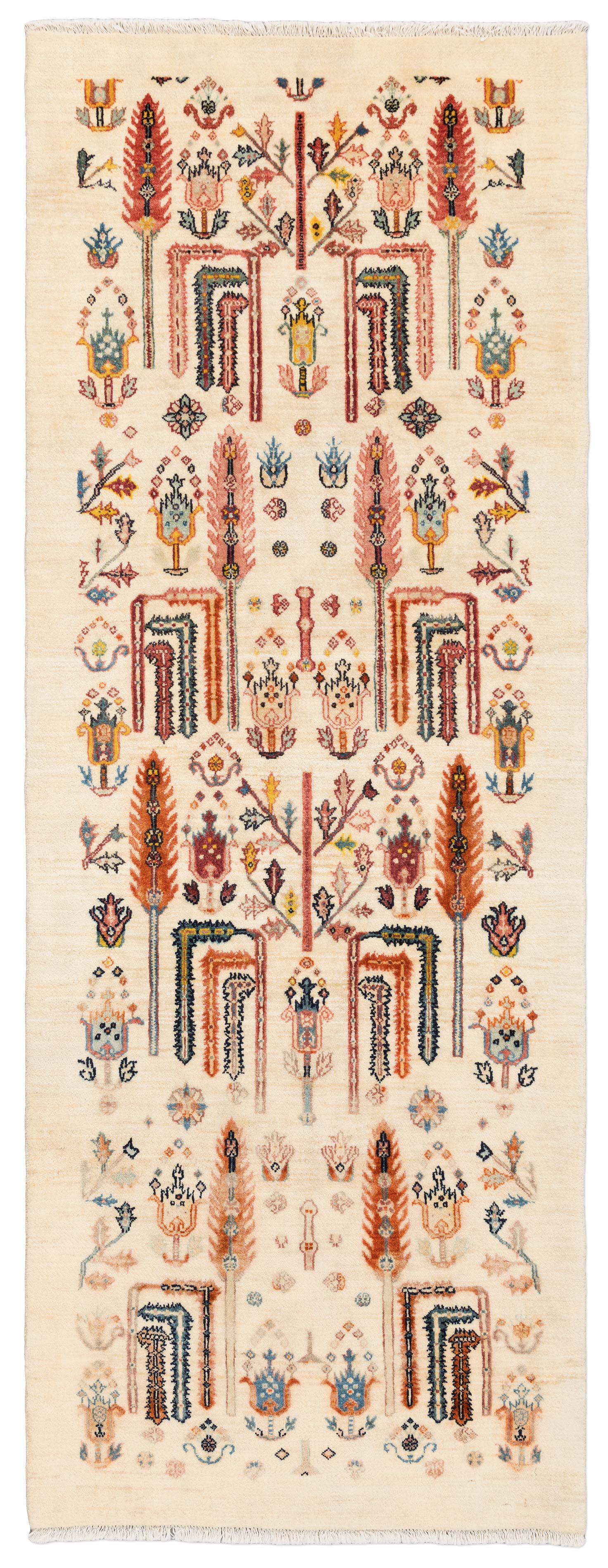 Dieser handgeknüpfte Bidjar-Gerus-Teppich besticht durch seine elegante Farbgebung und hochwertige Verarbeitung. Die Hauptfarbe ist ein sanftes Cremeweiß, das den Hintergrund des Teppichs dominiert und eine ruhige Basis bildet. Hinzu gesellen sich markante Akzente in einem warmen Rostrot, das die Lebensbaum-Motive lebendig erscheinen lässt. Ein tiefes Blau verleiht den Mustern Tiefe und Struktur, während ein sonniges Gelb subtile Highlights setzt. Zusätzlich sorgen fröhliche, bunte ...mehr Beschreibung
