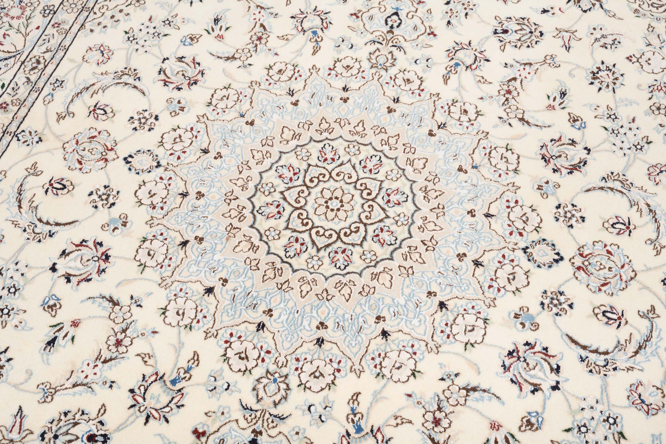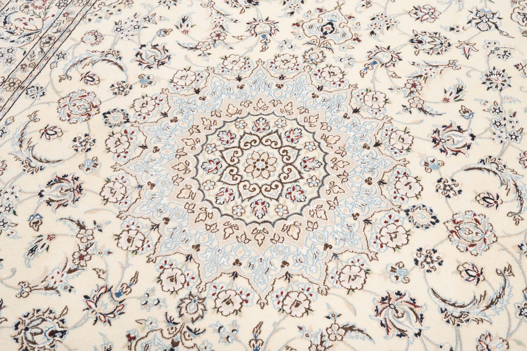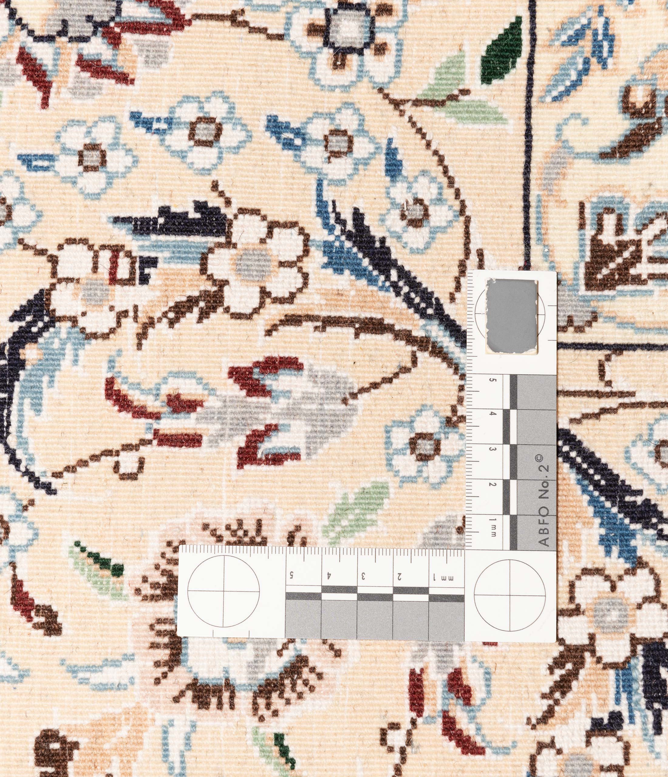 Dieser handgeknüpfte Nain-Teppich aus Persien beeindruckt durch seine elegante Farbkomposition. Die Hauptfarbe ist ein harmonisches Beige, das von sanften Blautönen und einem warmen, tiefen Rot ergänzt wird. Diese klassische Kombination verleiht dem Teppich eine zeitlose Eleganz und macht ihn zu einem wahrhaft edlen Kunstwerk. Das zentrale Medaillon und die floralen Muster sind präzise ausgearbeitet und verleihen dem Teppich eine raffinierte Symmetrie, die von der hohen Knüpfkunst zeugt. Mit einer beeindruckenden Knüpfdichte von ca. 360.000 Knoten pro Quadratmeter besteht der Teppich aus hochwertiger Korkwolle und Naturseide, die ihm einen seidig-weichen Glanz verleihen. Durch die Verwendung dieser natürlichen Materialien wird eine exzellente Musterung erzielt, die den Nain-Teppich zu einem begehrenswerten Stück für jedes stilvolle Zuhause macht. Treten Sie ein in die Welt persischer Tradition und lassen Sie sich von der exquisiten Handwerkskunst verzaubern.