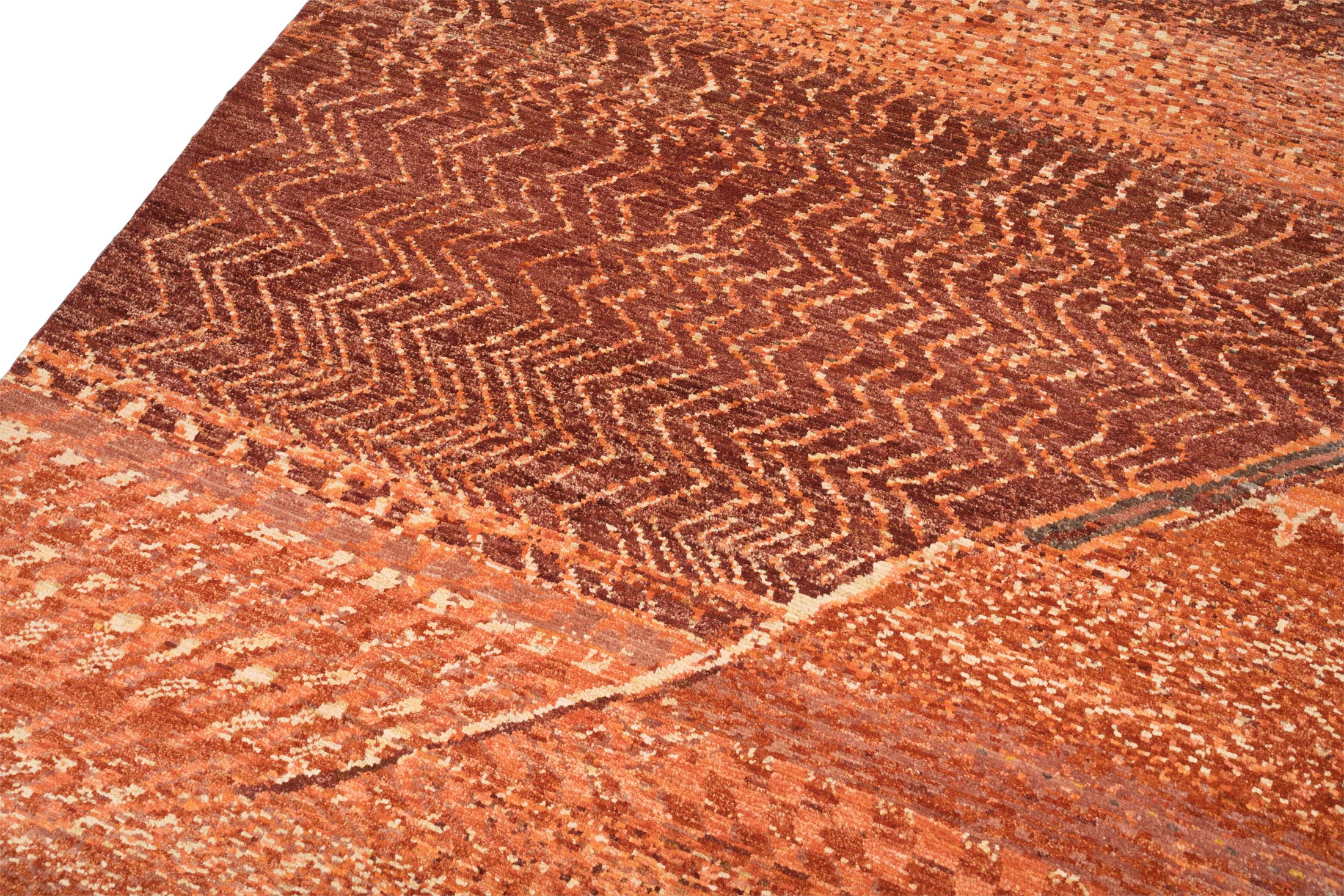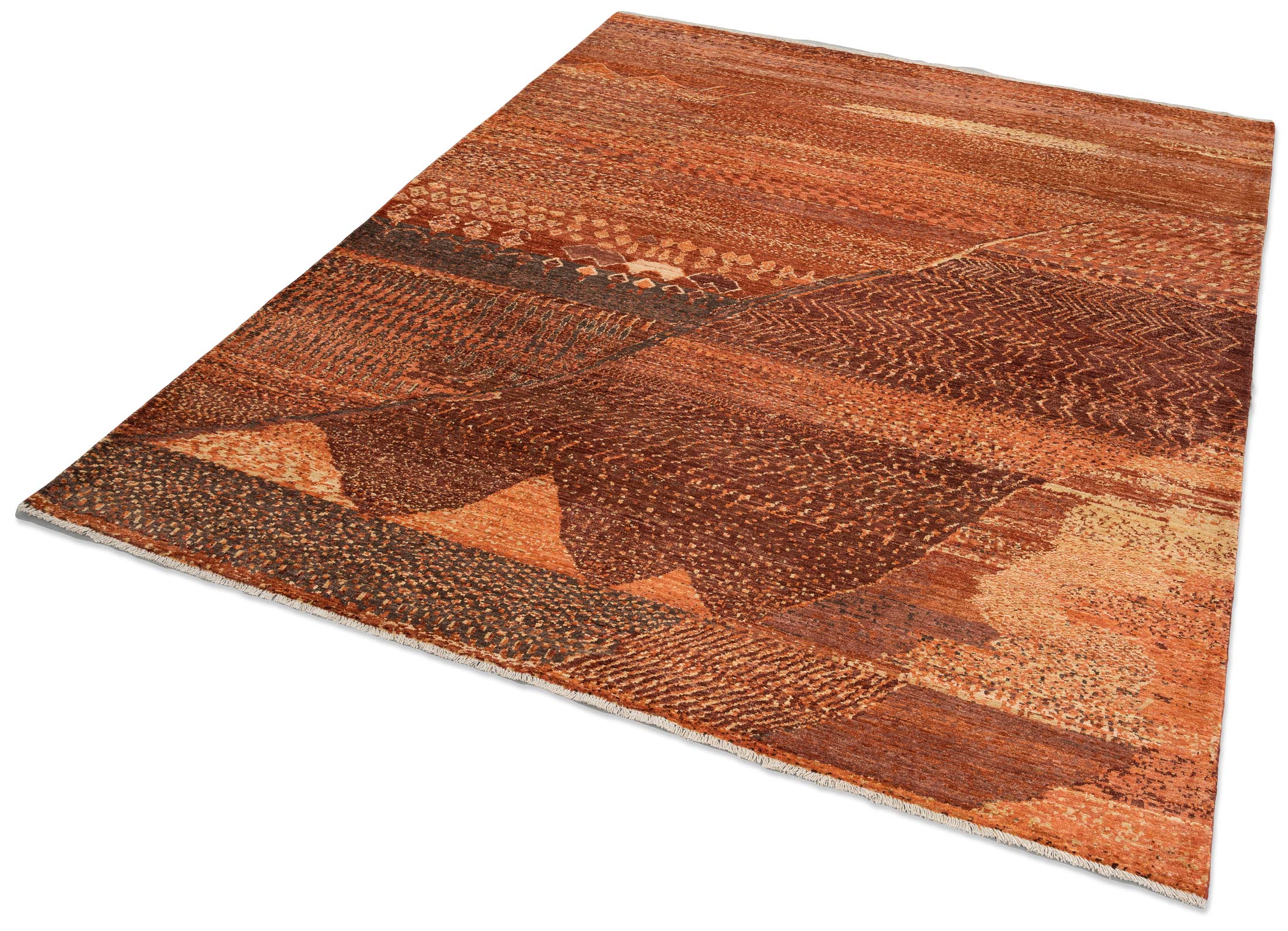 In einem zeitgenössischen Interieur wirkt dieser Teppich wie ein abstraktes Gemälde auf dem Boden, das moderne Kunst mit traditionellem Handwerk verbindet. Die komplexe Struktur und die hochwertigen Naturfarben brechen die oft kühle Strenge minimalistischer Möbel auf und sorgen für eine spannende visuelle Tiefe. Er beweist, dass modernes Design nicht glatt sein muss, sondern gerade durch die texturierte Oberfläche der handversponnenen Wolle an Exklusivität gewinnt. Dieses Stück ist ein Statement für Design-Liebhaber, die Wert auf nachhaltige Qualität und eine zeitlose, aber charakterstarke Ästhetik legen.