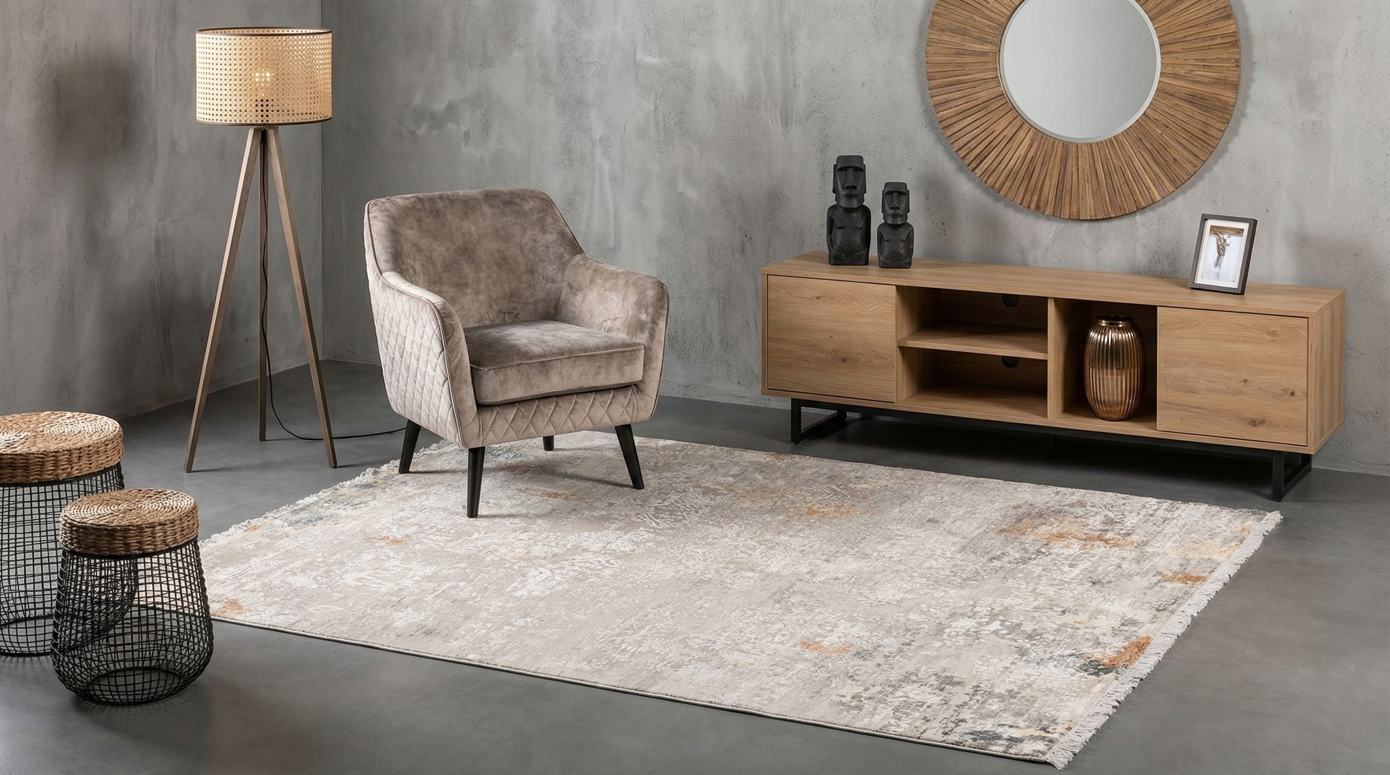 Dieser handgeknüpfte Teppich aus der Eterno-Kollektion besticht durch seine elegante Hauptfarbe in warmem Beige, die eine harmonische Basis bildet. Akzente in sanftem Rostorange und dezentem Grau verleihen dem Design Tiefe und Charakter. Die Musterung ist subtil und erinnert an traditionelle Ornamente, die kunstvoll in das Gewebe eingearbeitet sind. Der Teppich vereint Retrodesign mit einem modernen Touch und schafft so eine einzigartige Optik. Gefertigt aus erstklassiger, handgekardeter ...mehr Beschreibung