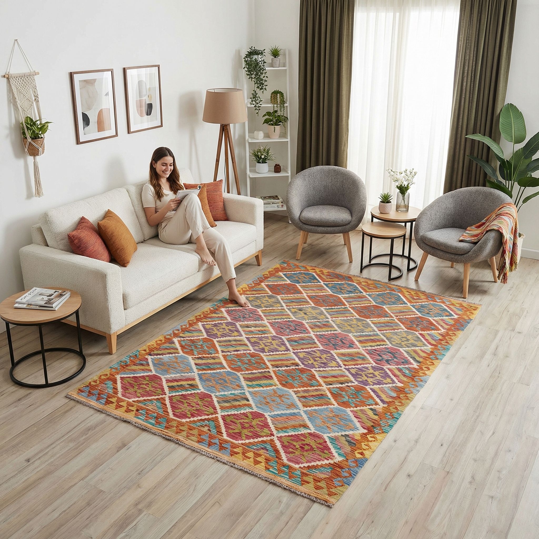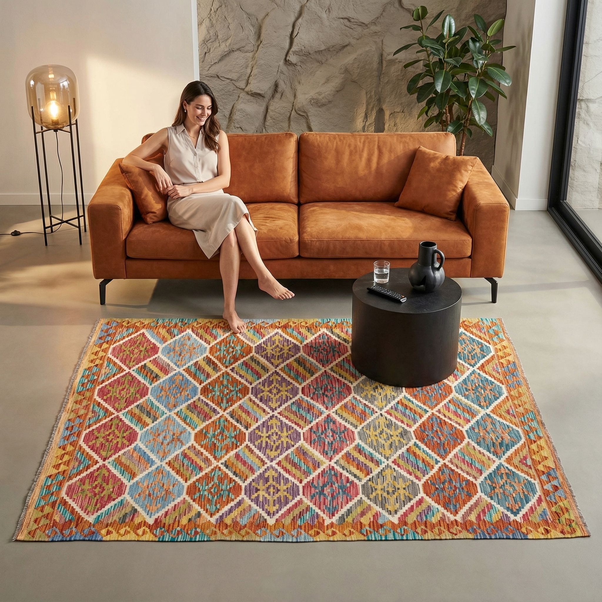 Hier präsentieren wir einen exquisiten Ghazghar-Kelim aus Afghanistan, der durch seine lebendige Farbpalette und fein handgewebte Qualität besticht. Die dominierende Farbe ist ein warmes Rostrot, das den Kelim mit seiner erdigen Eleganz prägt. Ergänzt wird diese Hauptfarbe durch ein kräftiges Blau, lebhaftes Gelb und sanftes Lila, die zusammen ein harmonisches Zusammenspiel erzeugen.Die Musterung des Teppichs ist geometrisch und reich an traditionellen Motiven, die an die ...