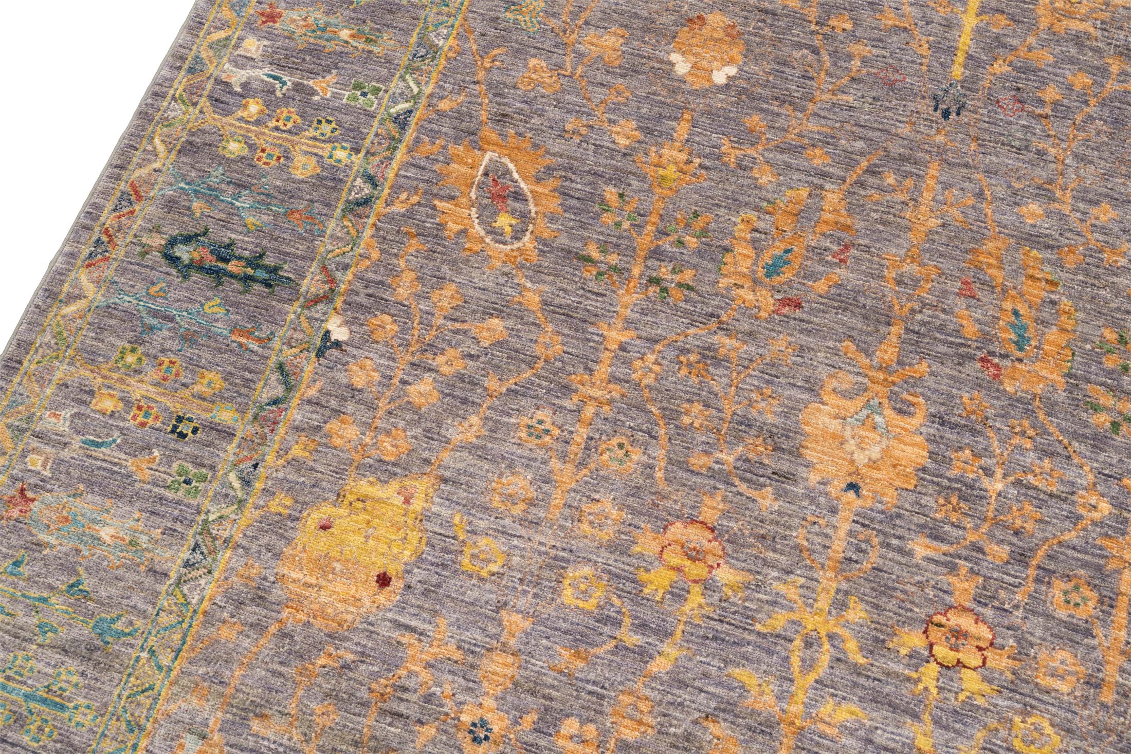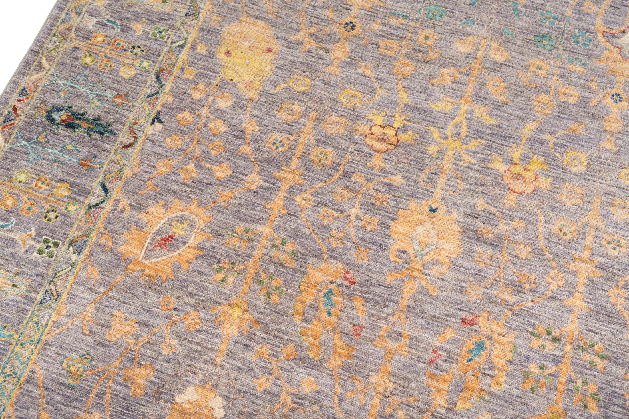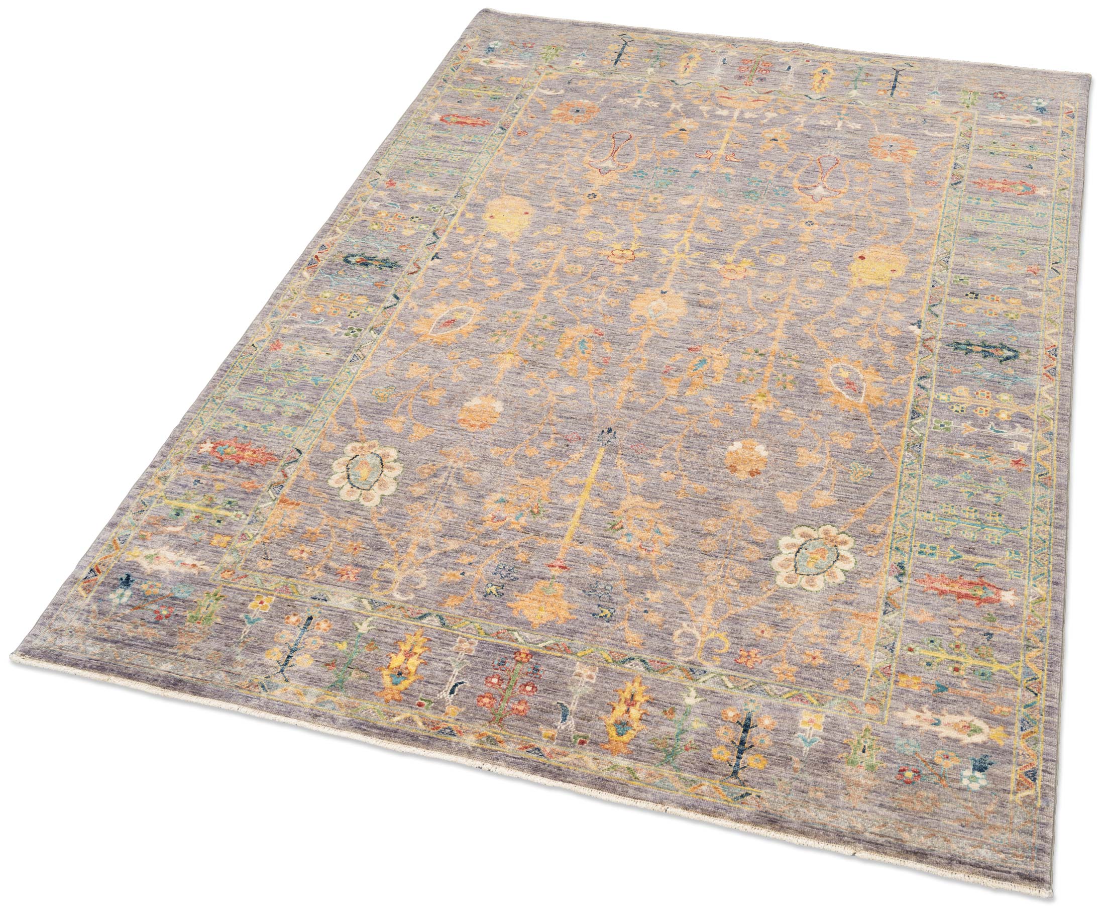 Hier präsentieren wir einen exquisiten Ferahan-Novum Teppich aus Afghanistan, der mit seiner einzigartigen Farbkomposition und handwerklichen Perfektion begeistert. Die Hauptfarbe dieses Meisterwerks ist ein edles Grau, das eine beruhigende und harmonische Basis bildet. Dazu ergänzen sich warme Ockertöne, die dem Teppich eine luxuriöse Ausstrahlung verleihen. Dezente Akzente in sanftem Grün und zartem Blau schaffen eine lebendige Vielfalt, während fröhliche, bunte Details das Gesamtbild abrunden.