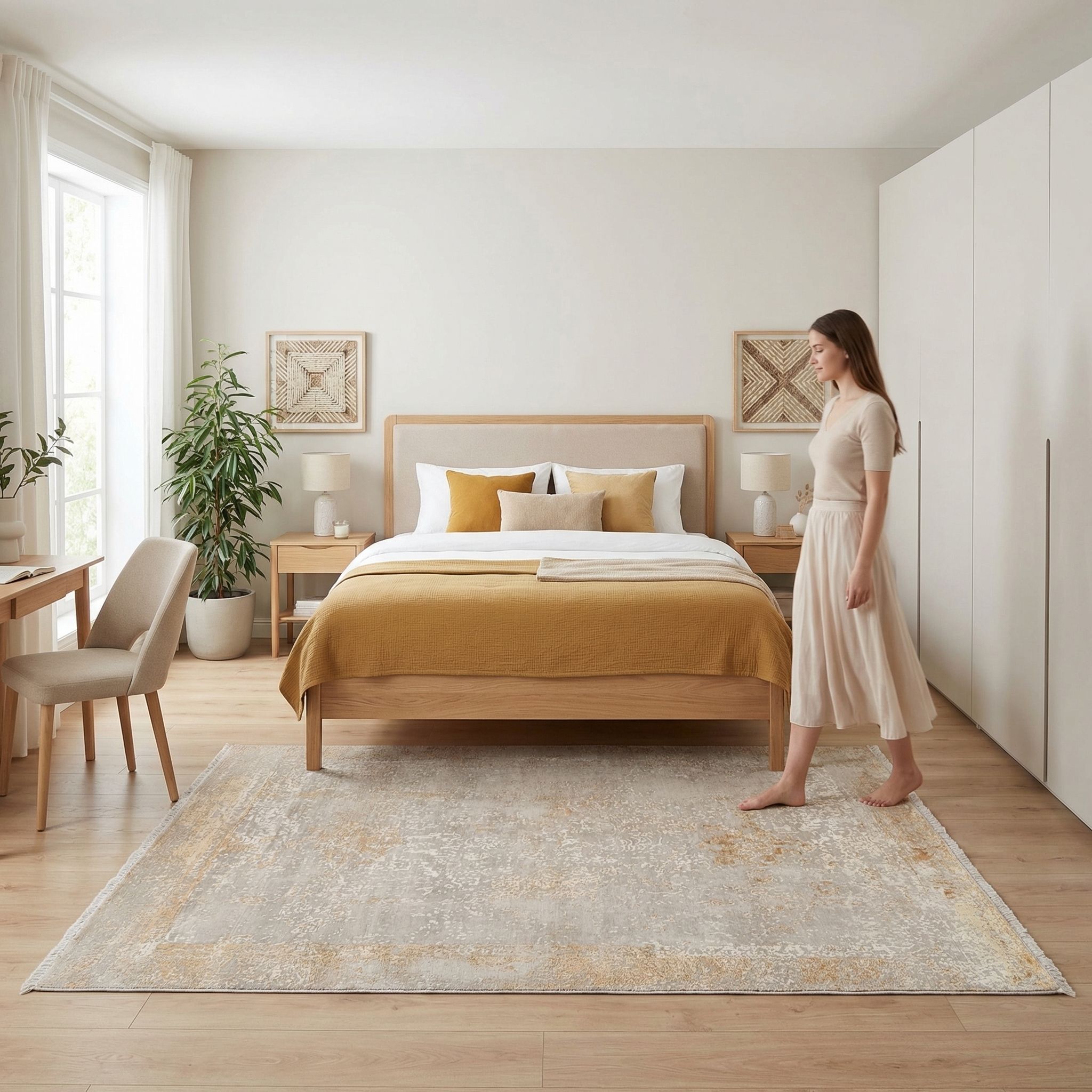 Die sanften Beige-, Sand- und Cremetöne dieses Teppichs harmonieren hervorragend mit der lichtdurchfluteten und reduzierten Ästhetik des skandinavischen Stils. Handkardierte Schafwolle von höchster Qualität bringt die im Norden so geschätzte Natürlichkeit und Wärme ("Hygge") in Ihr Zuhause, während das Design ruhig und unaufgeregt bleibt. Die nachhaltige Bambusseide unterstreicht zudem das skandinavische Bewusstsein für umweltfreundliche Materialien und Langlebigkeit. Dieser Teppich fungiert als sanfte, texturierte Basis, die helle Hölzer und weiße Möbelstücke weich und einladend wirken lässt.