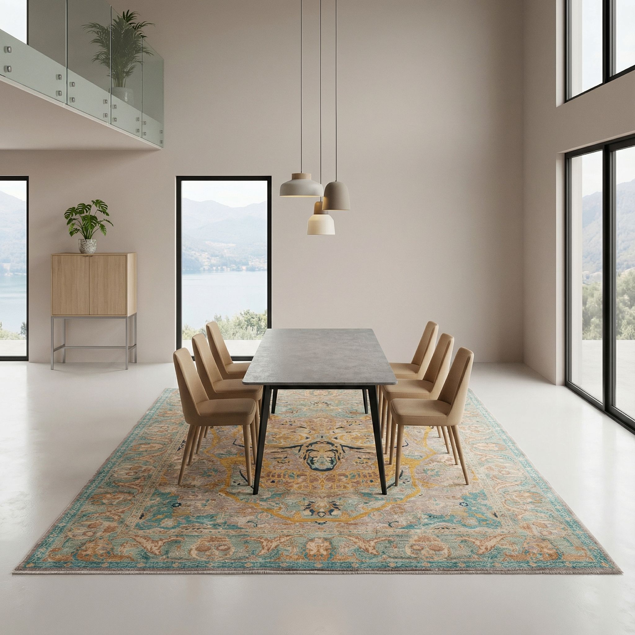 Dieser handgeknüpfte Ferahan-Novum-Teppich aus Afghanistan besticht durch seine lebendige Farbvielfalt und kunstvolle Musterung, die an den Día de los Muertos erinnert. Die Hauptfarbe ist ein sanftes Türkis, das die Basis dieses einzigartigen Kunstwerks bildet. Dazu gesellen sich warme Goldtöne und ein tiefes Marineblau, die dem Teppich eine faszinierende Tiefe und Lebendigkeit verleihen. Die Musterung zeigt sich in einem fantasievollen Spiel aus floralen und geometrischen Elementen, die den Geist der mexikanischen Feierlichkeit Día de los Muertos einfangen. Mit einer beeindruckenden Knotendichte von ca. 250.000 Knoten pro Quadratmeter und einer Dicke von etwa 6 mm, besteht der Teppich aus handgesponnener Schafwolle und natürlichen Farbstoffen. Diese hochwertigen Materialien und die sorgfältige Handarbeit garantieren eine außergewöhnliche Qualität und Langlebigkeit. Lassen Sie sich von der zeitlosen Eleganz und der kunstvollen Gestaltung dieses Teppichs verzaubern und verleihen Sie Ihrem Zuhause einen Hauch von Luxus und kultureller Tiefe.