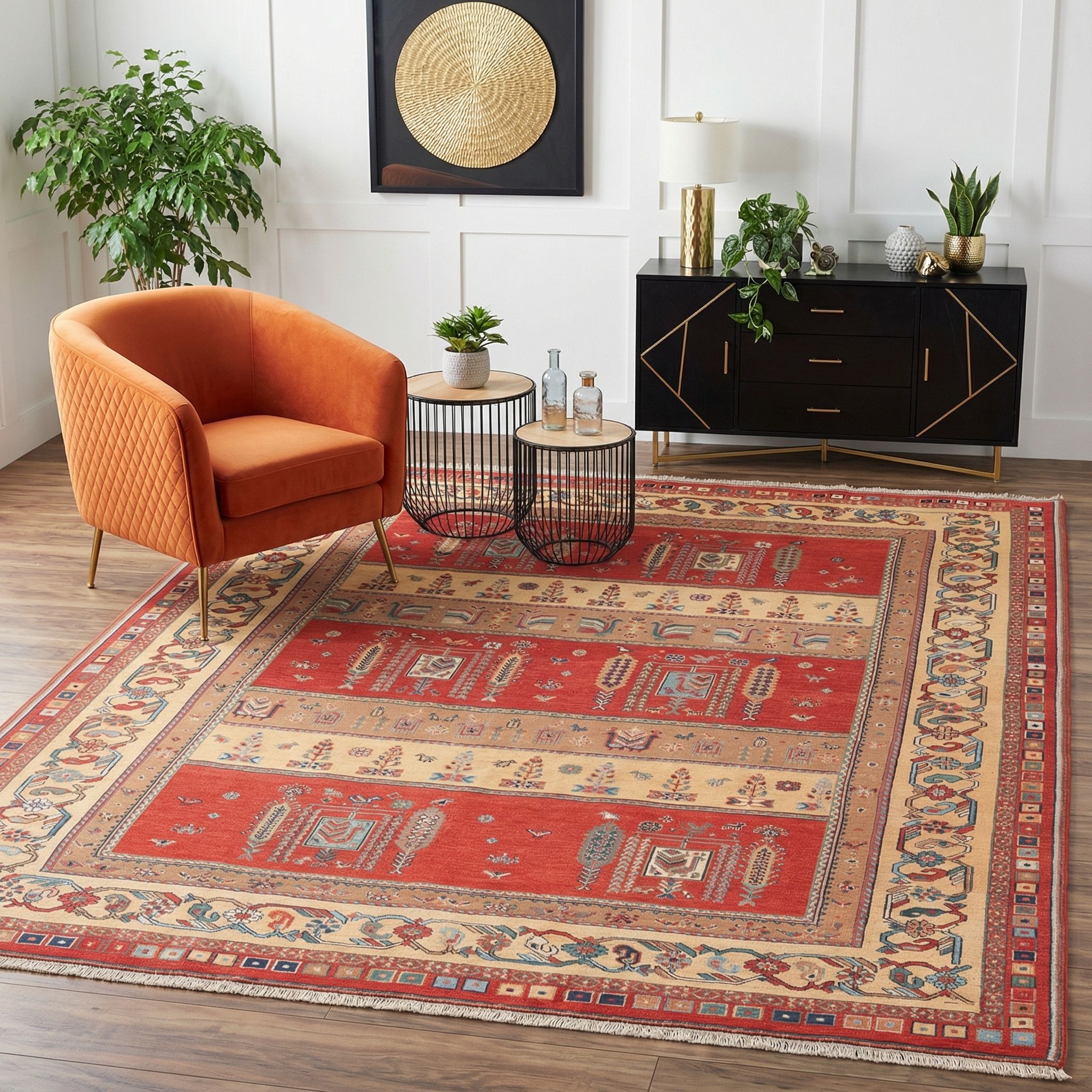 Im rauen Umfeld von Beton, Stahl und offenem Mauerwerk wirkt dieser kunstvolle Kelim als faszinierender Weichzeichner und sorgt für einen gekonnten Stilbruch. Die intensiven Naturfarben leuchten kraftvoll auf dunklen Industrieböden und verleihen dem kühlen Loft-Charakter sofort eine wohnliche, hochwertige Note. Dank seiner robusten Machart und der festen Struktur behauptet sich der Afschar-Tabii mühelos gegen die schwere Optik von Vintage-Ledersofas und Metallregalen. Er fügt dem maskulinen Industrial-Look eine Ebene von handwerklicher Finesse und historischer Beständigkeit hinzu, ohne dabei verspielt zu wirken.