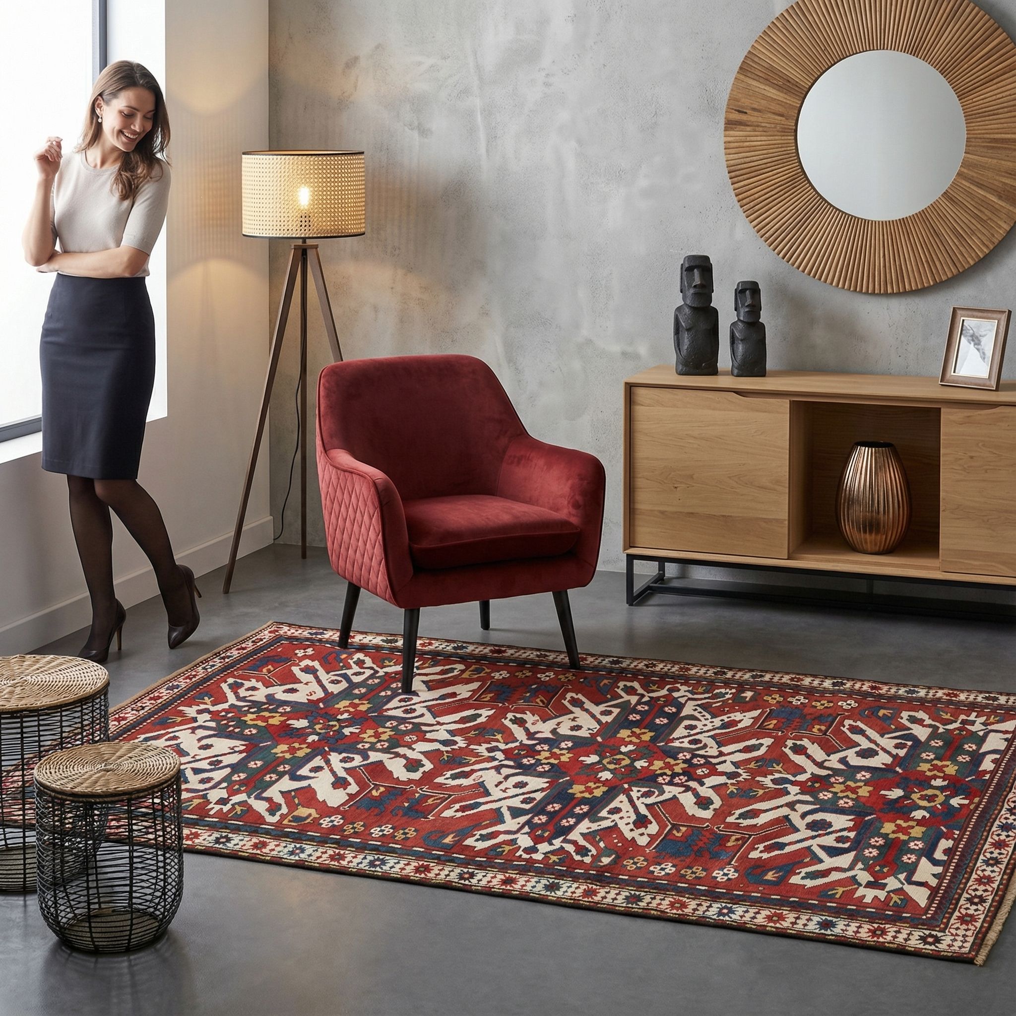 Hier präsentieren wir einen beeindruckenden antiken Adlerkazak-Teppich, der mit seinen handgeknüpften Details und der lebendigen Farbgebung fasziniert. Die Hauptfarbe dieses außergewöhnlichen Stücks ist ein intensives Karminrot, das das zentrale Feld dominiert und den Blick des Betrachters sofort einfängt. Ergänzt wird diese kräftige Farbgebung durch ein tiefes Blau, das den Medaillons und Mustern eine elegante Tiefe verleiht. Ein strahlendes Elfenbeinweiß hebt die detaillierten Muster ...mehr Beschreibung