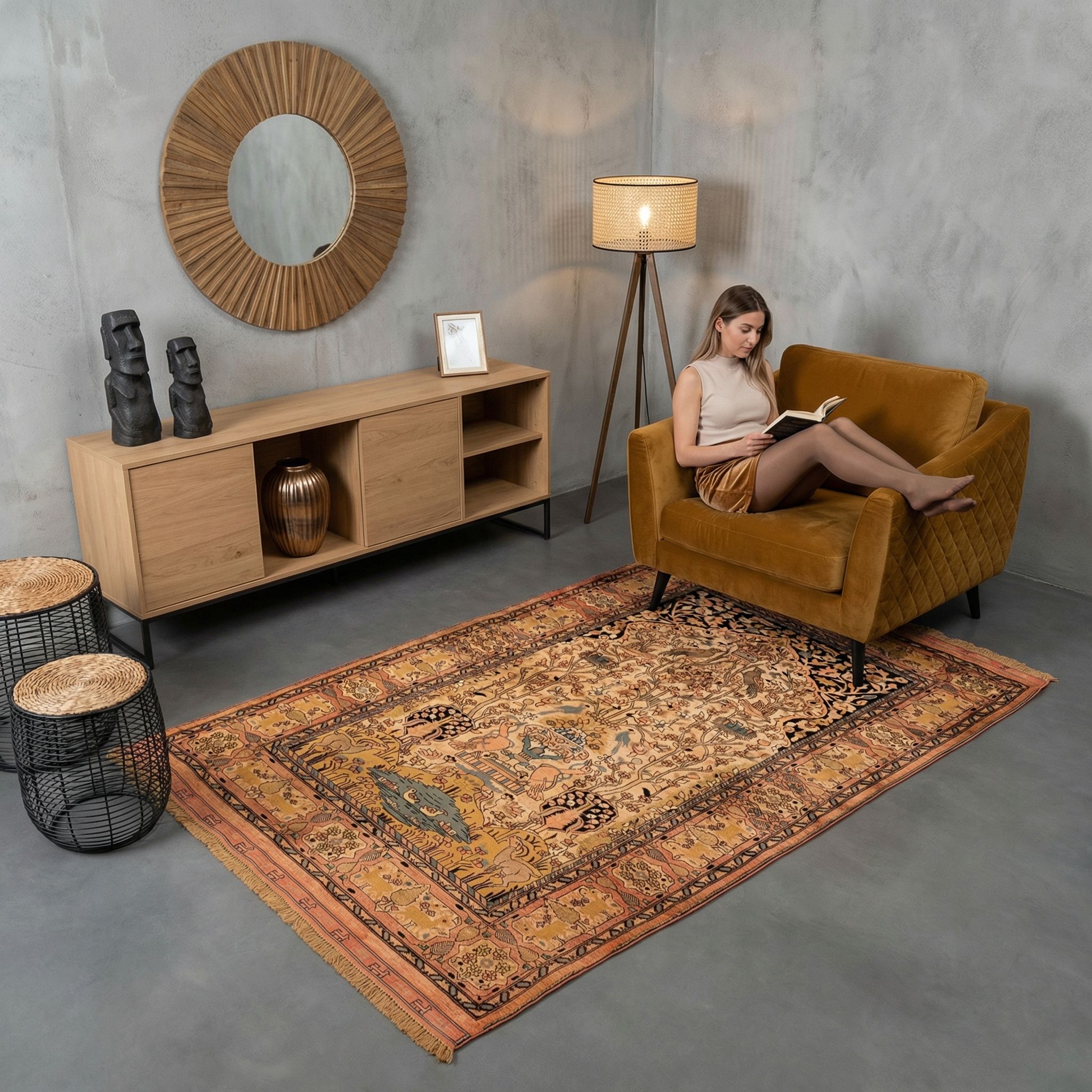 Dieser außergewöhnliche Gotschan-Teppich aus Persien besticht durch seine warme, goldene Hauptfarbe, die dem gesamten Stück eine elegante Aura verleiht. Begleitet wird dieser Ton von einem tiefen Indigo, der die Details und Musterungen wunderbar hervorhebt. Ergänzt wird das Farbspektrum durch sanfte Kupfertöne und ein dezentes Creme, das die floralen und tierischen Muster akzentuiert. Die harmonische Farbpalette verleiht dem Teppich eine fröhliche und lebendige Ausstrahlung.Die ...