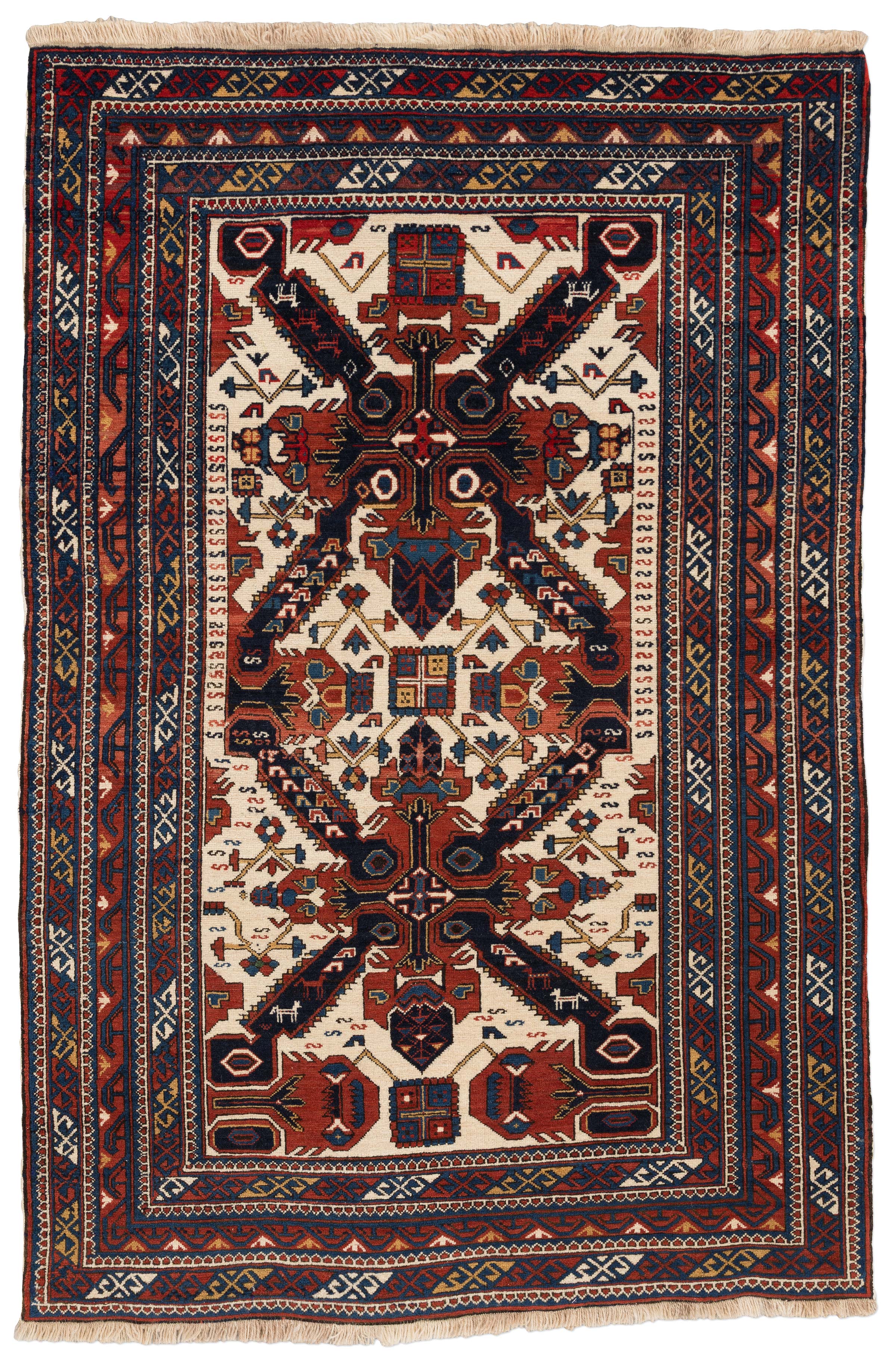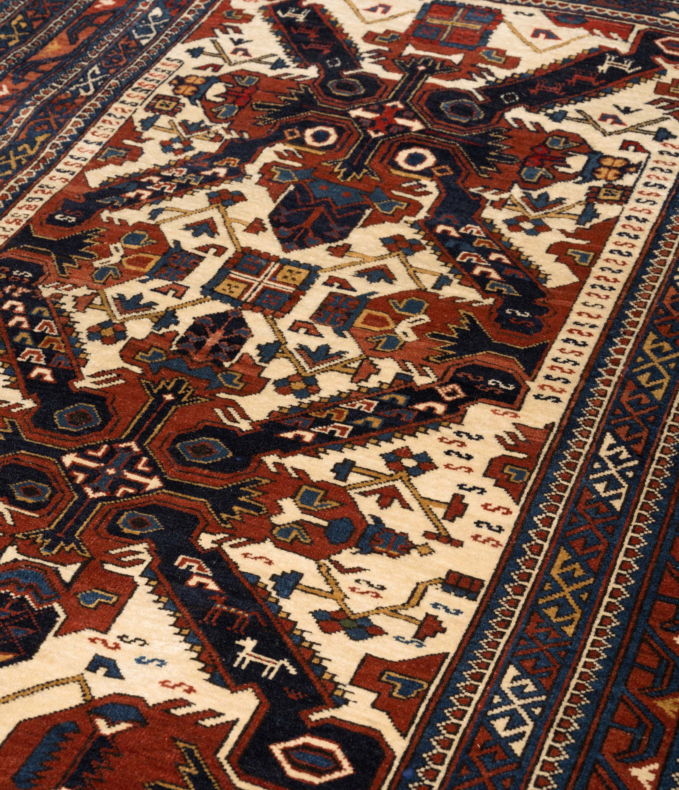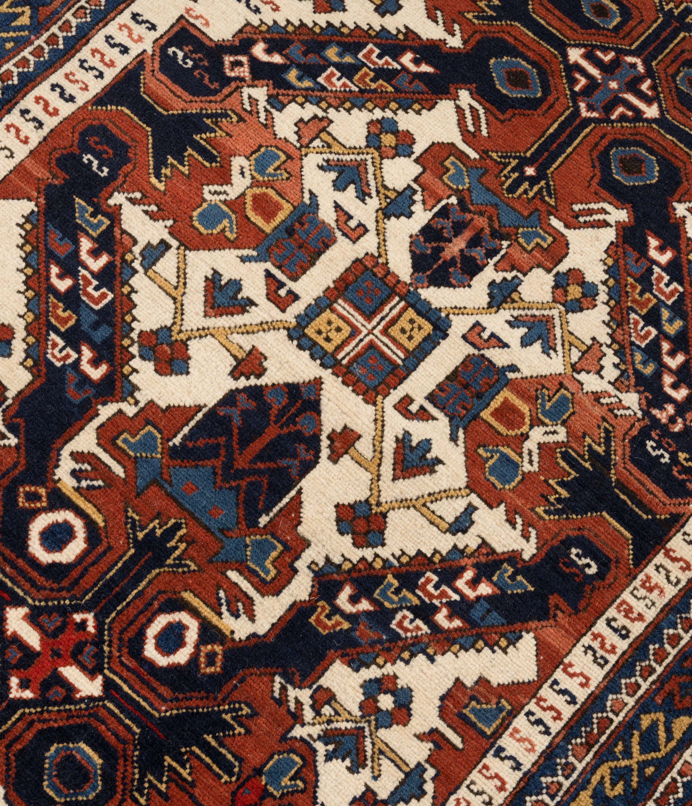 Dieser antike Seychur-Teppich aus dem Jahr 1920 stammt aus dem Ostkaukasus, genauer gesagt aus dem Kuba-Schirwan-Gebiet, und beeindruckt durch seine sorgfältige handgeknüpfte Verarbeitung. Die Hauptfarbe des Teppichs ist ein warmes, erdiges Dunkelrot, das von einem tiefen Blau begleitet wird. Ein sanftes Beige fügt sich harmonisch ein und wird von Akzenten in Schwarz ergänzt. Diese harmonische Farbgebung verleiht dem Teppich einen eleganten und zeitlosen Charakter. Die Musterung ist typisch ...mehr Beschreibung