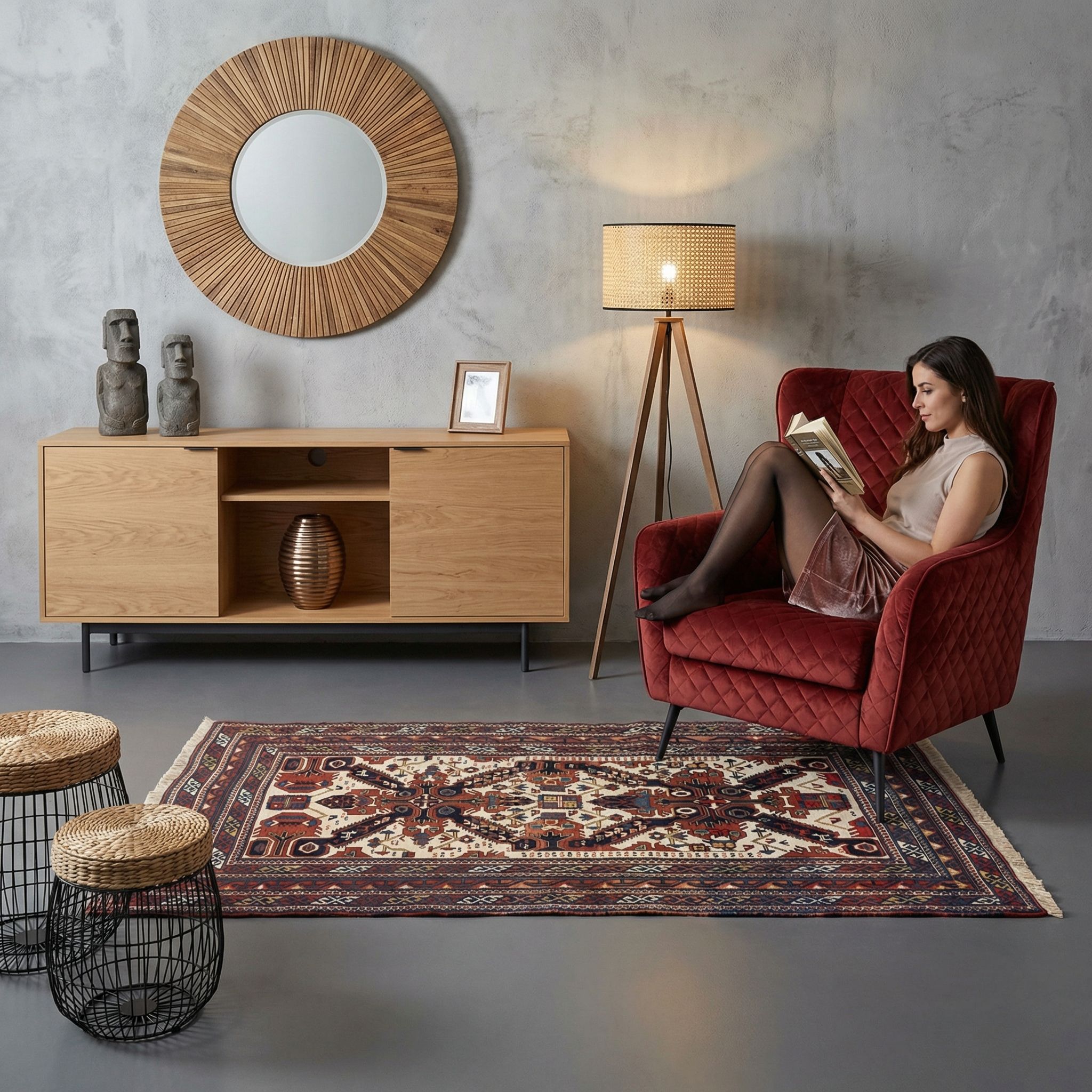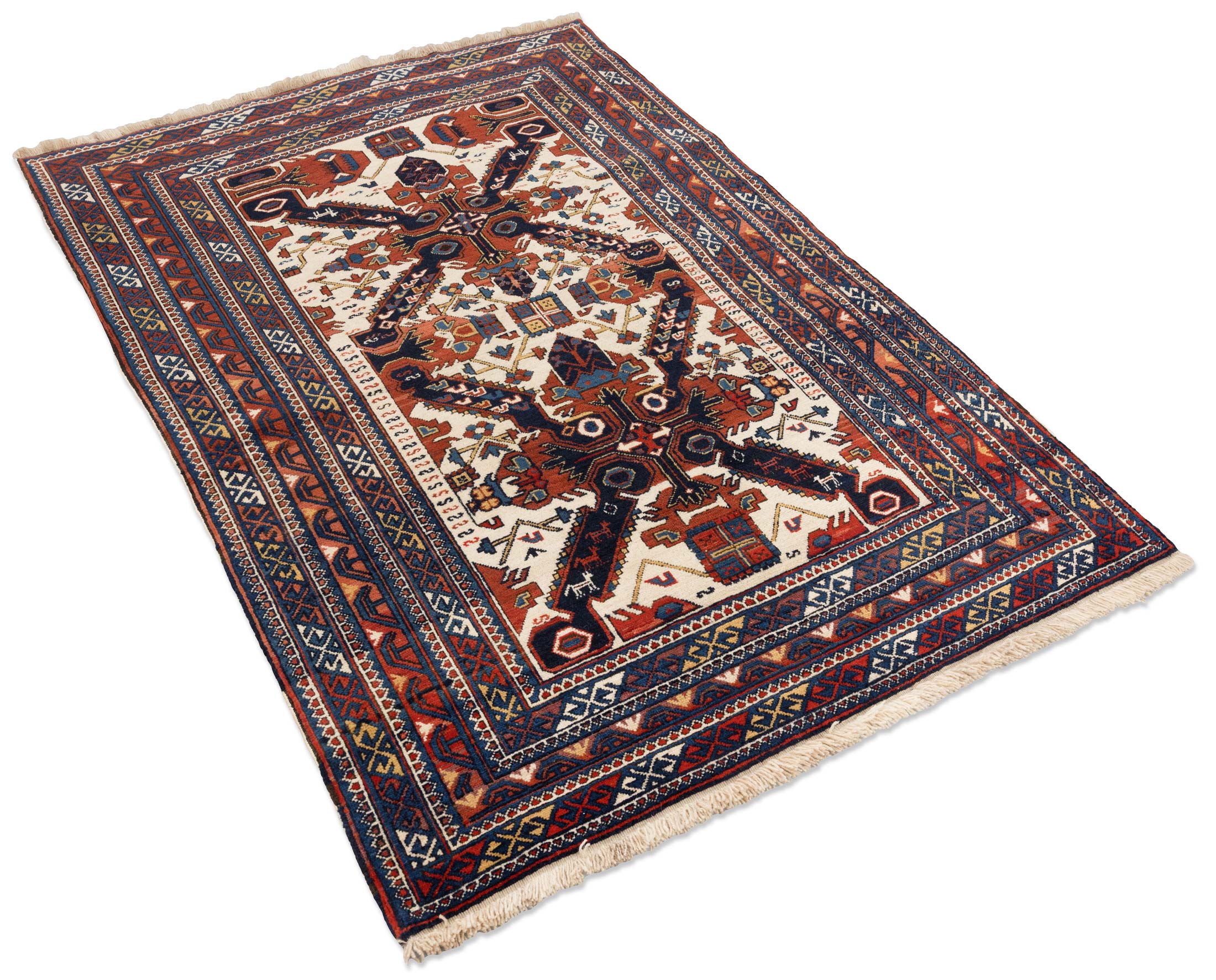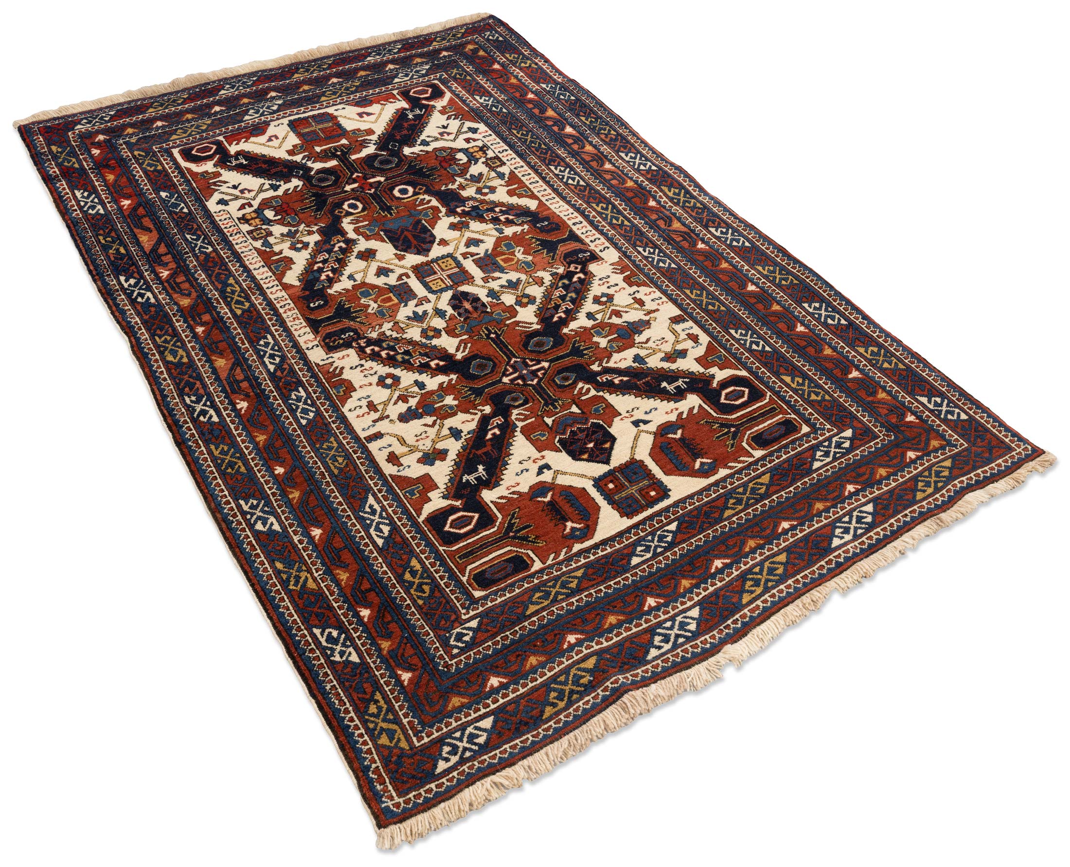 Dieser antike Seychur-Teppich aus dem Jahr 1920 stammt aus dem Ostkaukasus, genauer gesagt aus dem Kuba-Schirwan-Gebiet, und beeindruckt durch seine sorgfältige handgeknüpfte Verarbeitung. Die Hauptfarbe des Teppichs ist ein warmes, erdiges Dunkelrot, das von einem tiefen Blau begleitet wird. Ein sanftes Beige fügt sich harmonisch ein und wird von Akzenten in Schwarz ergänzt. Diese harmonische Farbgebung verleiht dem Teppich einen eleganten und zeitlosen Charakter. Die Musterung ist typisch ...mehr Beschreibung